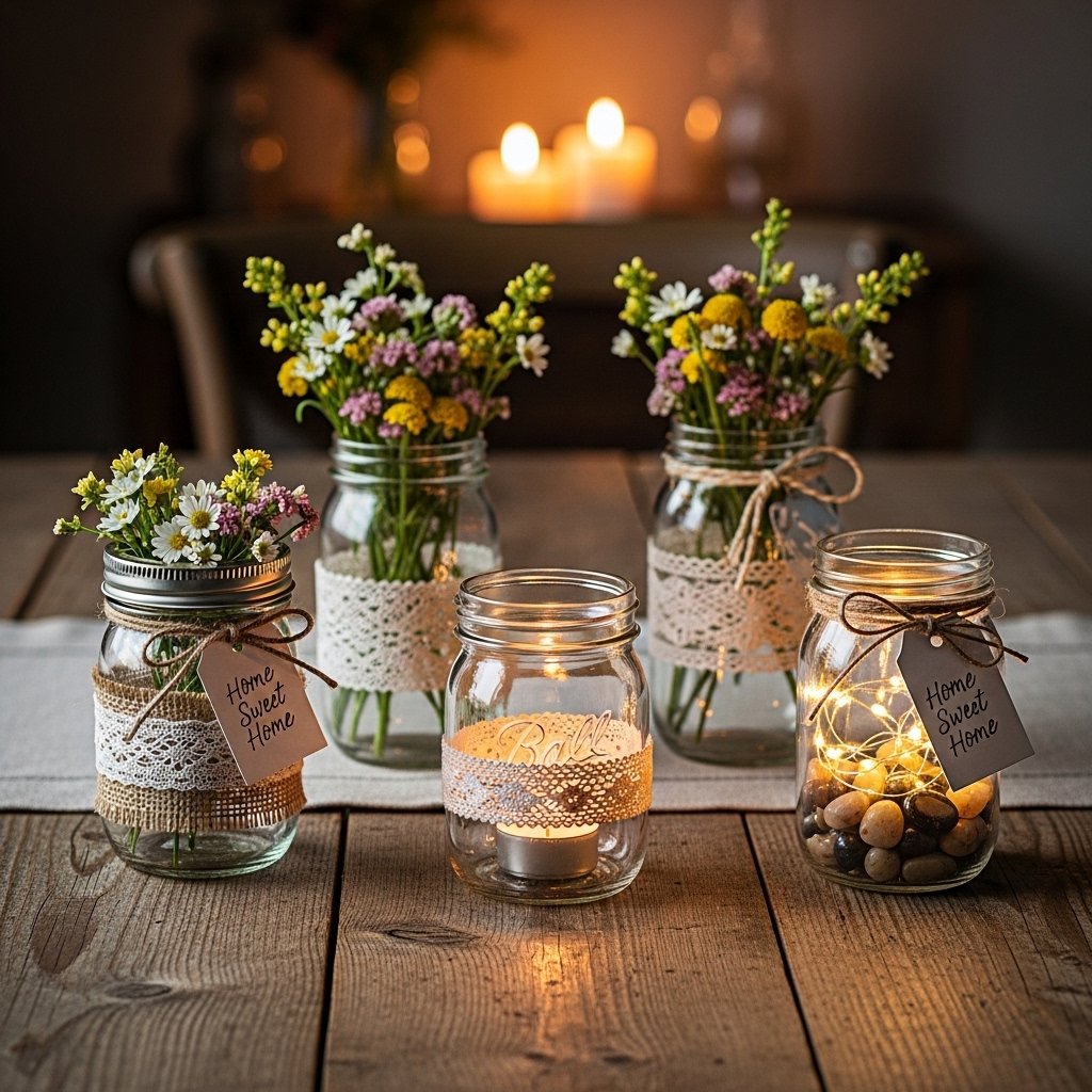 Mason jars are a versatile DIY decor element widely used in USA homes. You can turn them into vases, candle holders, or storage containers with a bit of creativity. Painting or decorating jars with twine, lace, or ribbons adds a rustic charm. These jars can be used on shelves, tables, or window sills for a cozy vibe. They are affordable, easy to customize, and perfect for beginners.