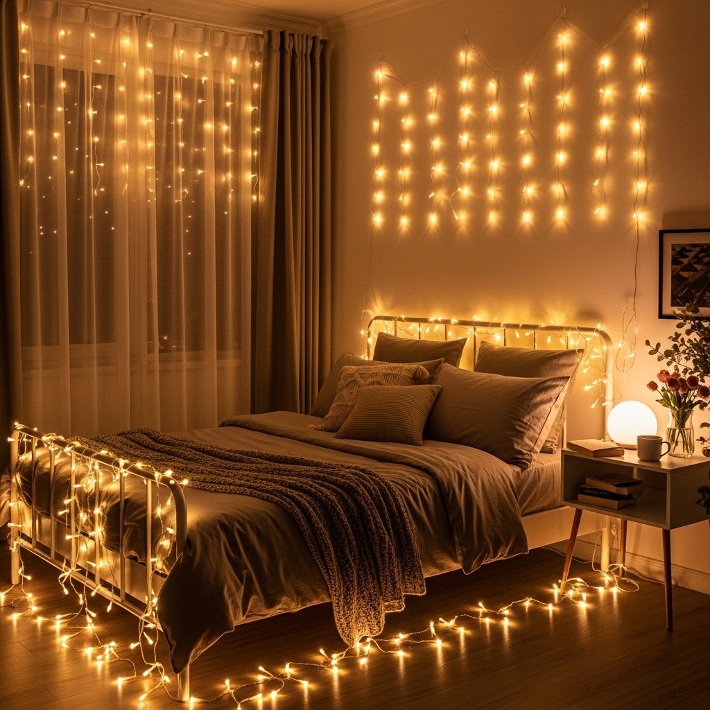 String lights are a simple yet effective way to create a warm and inviting atmosphere in your room. You can hang them along walls, windows, or bed frames for a soft glow. In the USA, string light decor is often combined with photos, curtains, or greenery for a cozy aesthetic. This idea is especially popular for bedrooms and small apartments. It’s an easy DIY project that instantly elevates your space.