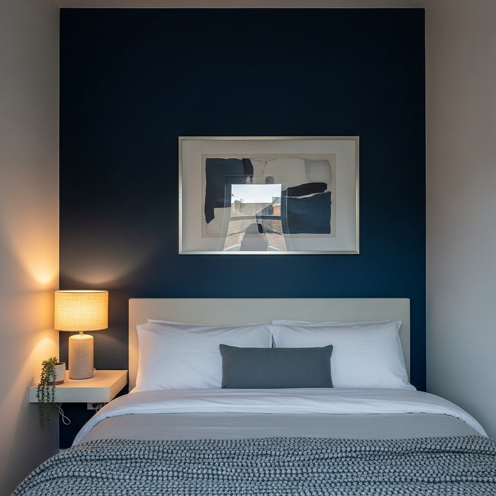 A bold blue accent wall is a great way to add depth and personality to a small bedroom. Deep navy or teal works well behind the headboard to create a focal point. You can combine this with lighter walls or neutral décor to prevent the room from feeling cramped. Adding framed art or mirrors on the accent wall enhances style while reflecting light. This approach makes the bedroom feel modern, cozy, and visually dynamic.