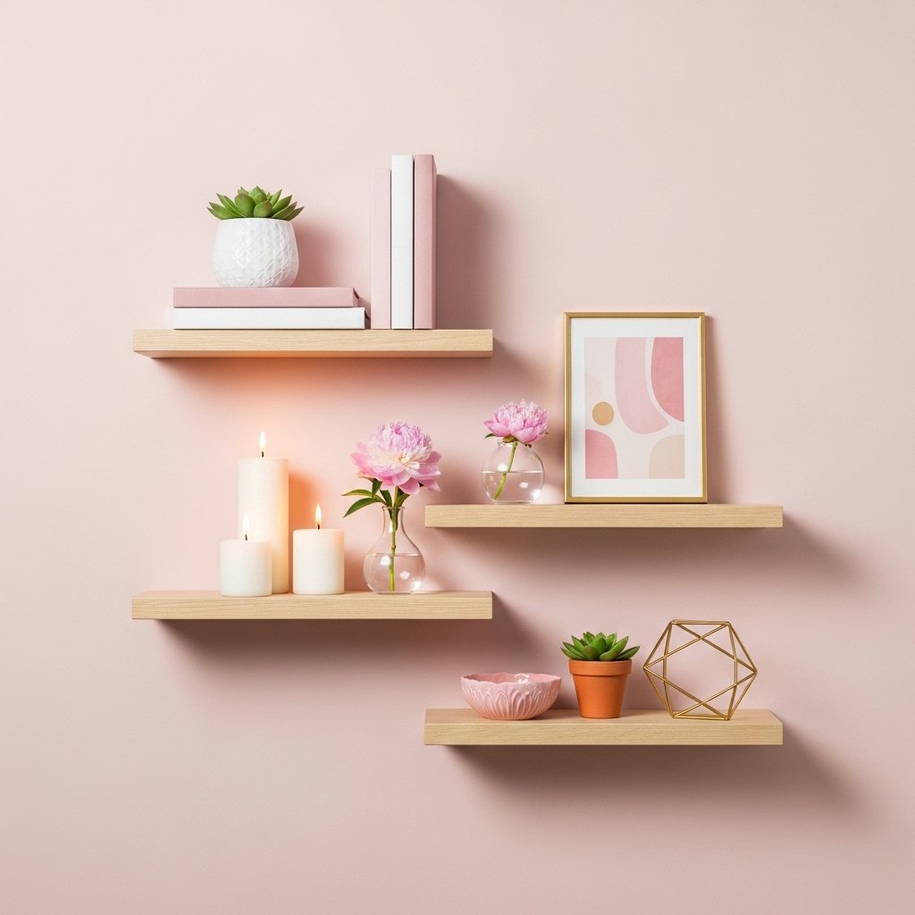 Floating shelves save floor space while enhancing the cozy aesthetic look. Small plants, candles, and books styled with pink accents create a curated vibe. Because they are mounted on the wall, they keep the room open and uncluttered. Matching shelf decor colors keeps everything visually organized. This idea adds personality without sacrificing functionality.