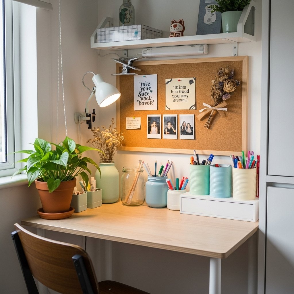 Creating a small study corner is important for teen girls, even in limited spaces. DIY desk decor using jars, organizers, and recycled containers keeps supplies tidy. Decorating the desk area with photos, lights, or cork boards adds motivation and style. Keeping the desk minimal helps maintain a clean and spacious look. This idea blends productivity with affordable room decor.
