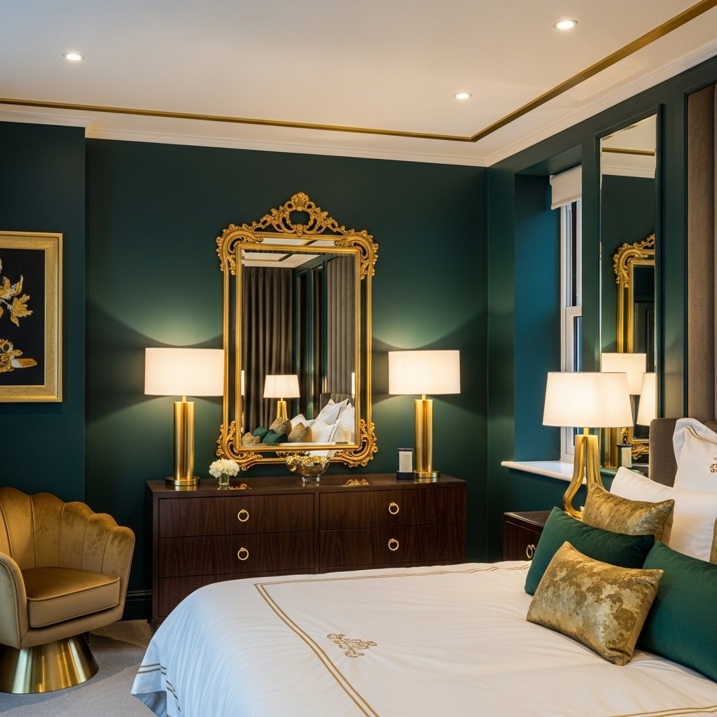 Adding gold accents to a green-walled bedroom creates a touch of elegance and luxury. Gold lamps, mirrors, or picture frames contrast beautifully with green tones. This combination works especially well with darker shades like emerald or olive green. The metallic accents reflect light, adding brightness to a small room. It’s a stylish way to elevate your bedroom design while maintaining coziness.