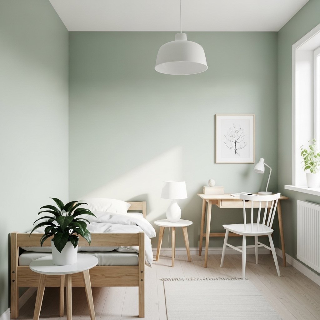 Soft sage green walls are perfect for creating a calm and cozy atmosphere in a small bedroom. This muted shade reflects light gently, making the space feel brighter and more open. Pairing sage green with minimal furniture helps avoid clutter and keeps the room visually spacious. Simple wooden or white furniture enhances the natural and relaxing vibe of the room. This combination works especially well for modern, Scandinavian, and minimalist interiors.