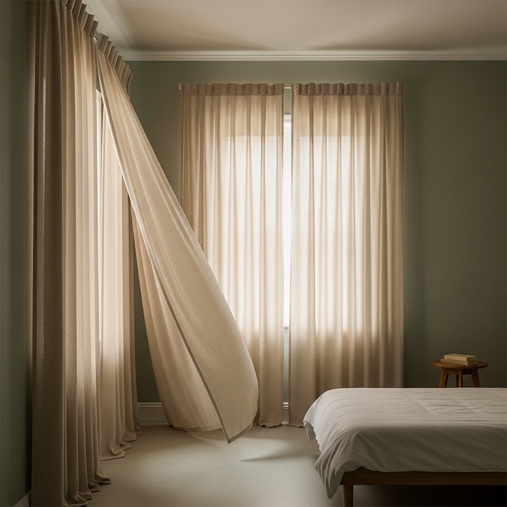Soft neutral curtains, such as beige, cream, or light gray, pair beautifully with green walls in a small bedroom. Curtains help control natural light while adding softness to the overall design. Light-colored curtains create an airy and open feel, preventing the room from looking too dark. Flowing fabrics also add a touch of elegance and coziness. This simple addition can significantly enhance the overall ambiance of the space.
