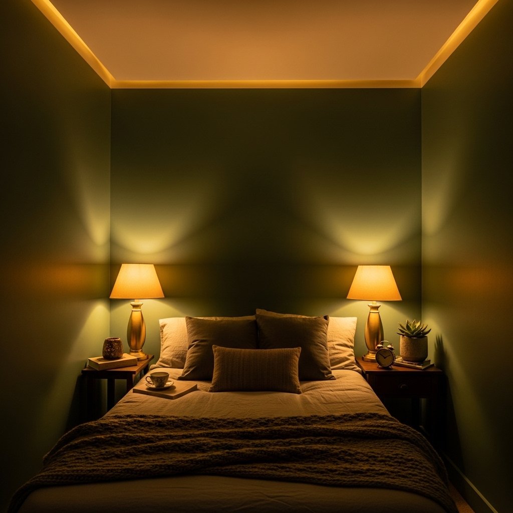Layered lighting can completely transform a small bedroom with green walls into a cozy haven. Combining ambient, task, and accent lighting ensures the room feels warm and functional. Soft bedside lamps or wall sconces work beautifully against green walls. Warm lighting enhances the richness of green tones and adds depth to the space. This setup is perfect for creating a relaxing nighttime atmosphere.