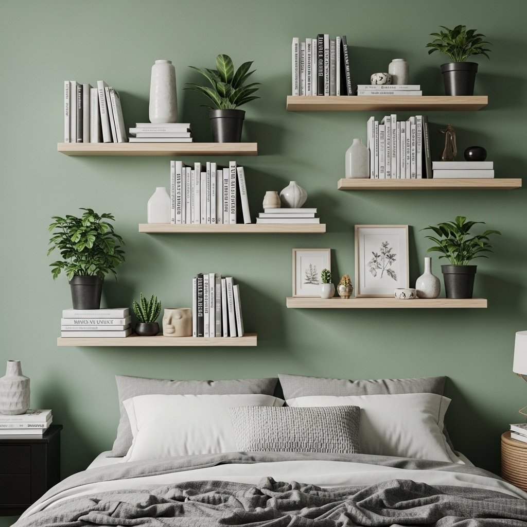 Floating shelves are a smart way to maximize space in a small bedroom with green walls. They provide storage without taking up valuable floor space, helping maintain a clean and open layout. Displaying books, plants, or small decor items on floating shelves adds personality to the room. Wooden or white shelves look especially beautiful against green backgrounds. This idea combines functionality with aesthetic appeal.