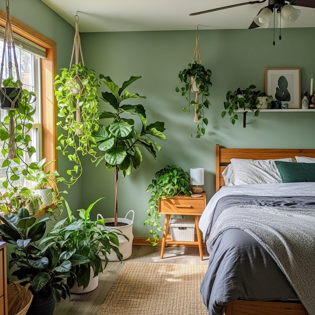 Adding indoor plants to a bedroom with green walls enhances the natural and cozy vibe. Plants complement green tones and create a seamless connection with nature. Even small plants like succulents or hanging vines can make a big difference in a compact space. This combination improves air quality and adds life to the room. It’s a perfect choice for anyone who loves a fresh and calming environment.