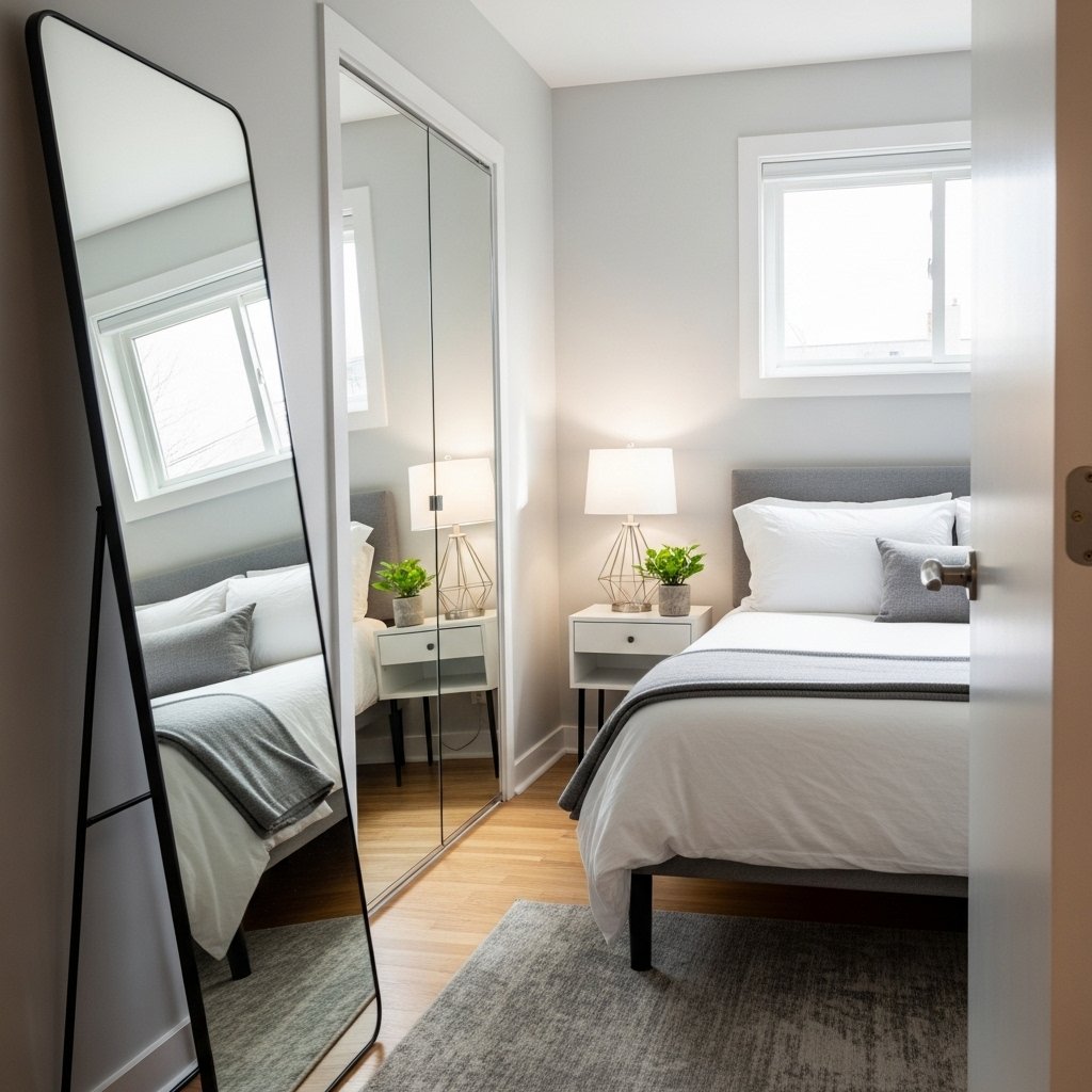 Mirrors are essential in small modern bedrooms, reflecting light and visually enlarging the room. A large wall mirror behind the bed or a standing mirror in a corner makes the space feel brighter and more open. Mirrored closet doors are another smart solution to maximize light while maintaining functionality. Couples can enjoy the aesthetic benefit without sacrificing storage or design. Strategically placed mirrors enhance both style and the perception of space.