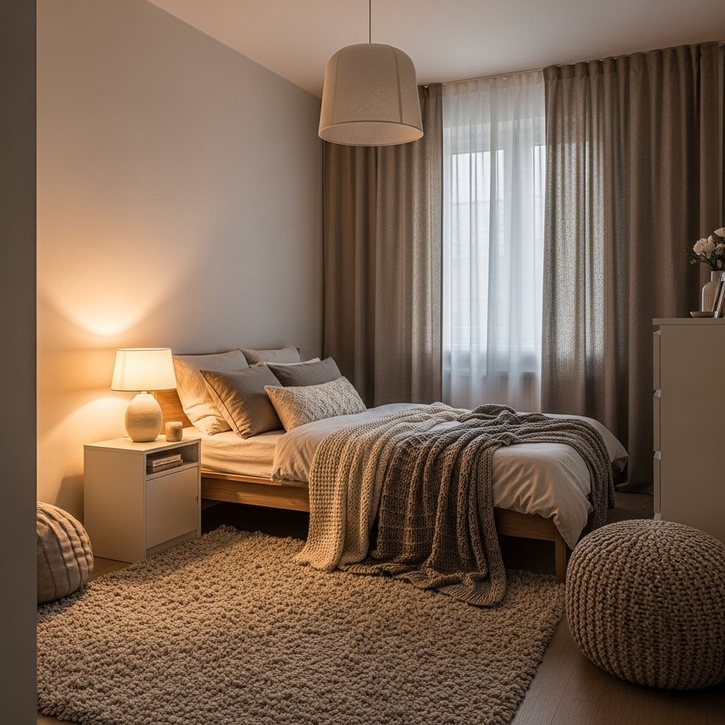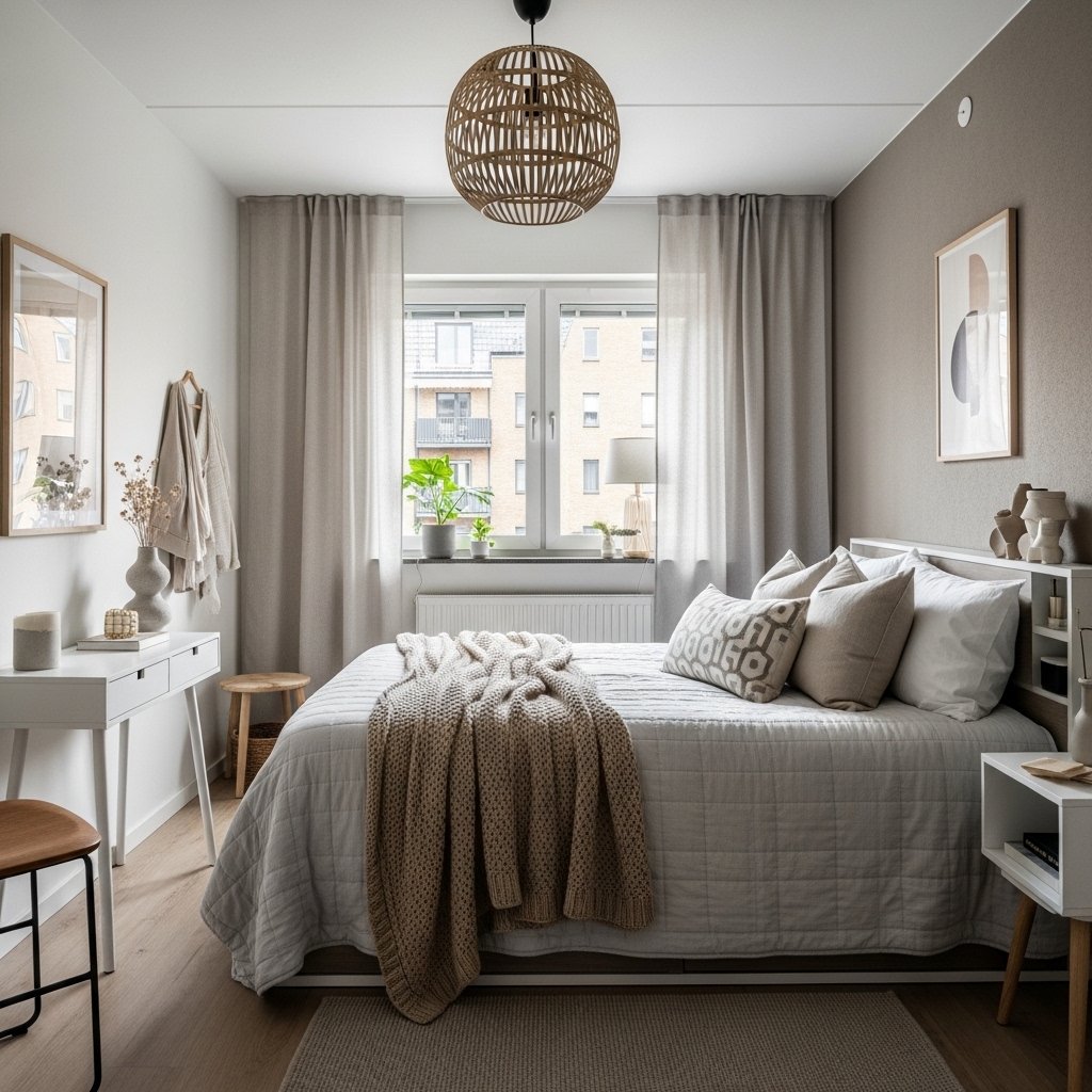A neutral color palette instantly makes a small bedroom feel larger and calmer. Soft shades of beige, cream, gray, or muted pastels work well for walls, bedding, and furniture. Layered textures like plush rugs, knitted throws, and linen curtains add warmth without overcrowding the space. For couples, coordinating neutral tones with subtle accent colors can create harmony and personal style. This approach enhances the cozy atmosphere while maintaining a modern minimalist feel.