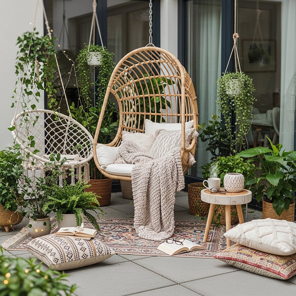 A hanging chair is a trendy addition to any small patio interior design. It adds a playful yet elegant touch while saving floor space. These chairs are perfect for reading, relaxing, or enjoying fresh air. Choose sturdy installation points to ensure safety and durability. This feature instantly becomes a focal point in your patio.