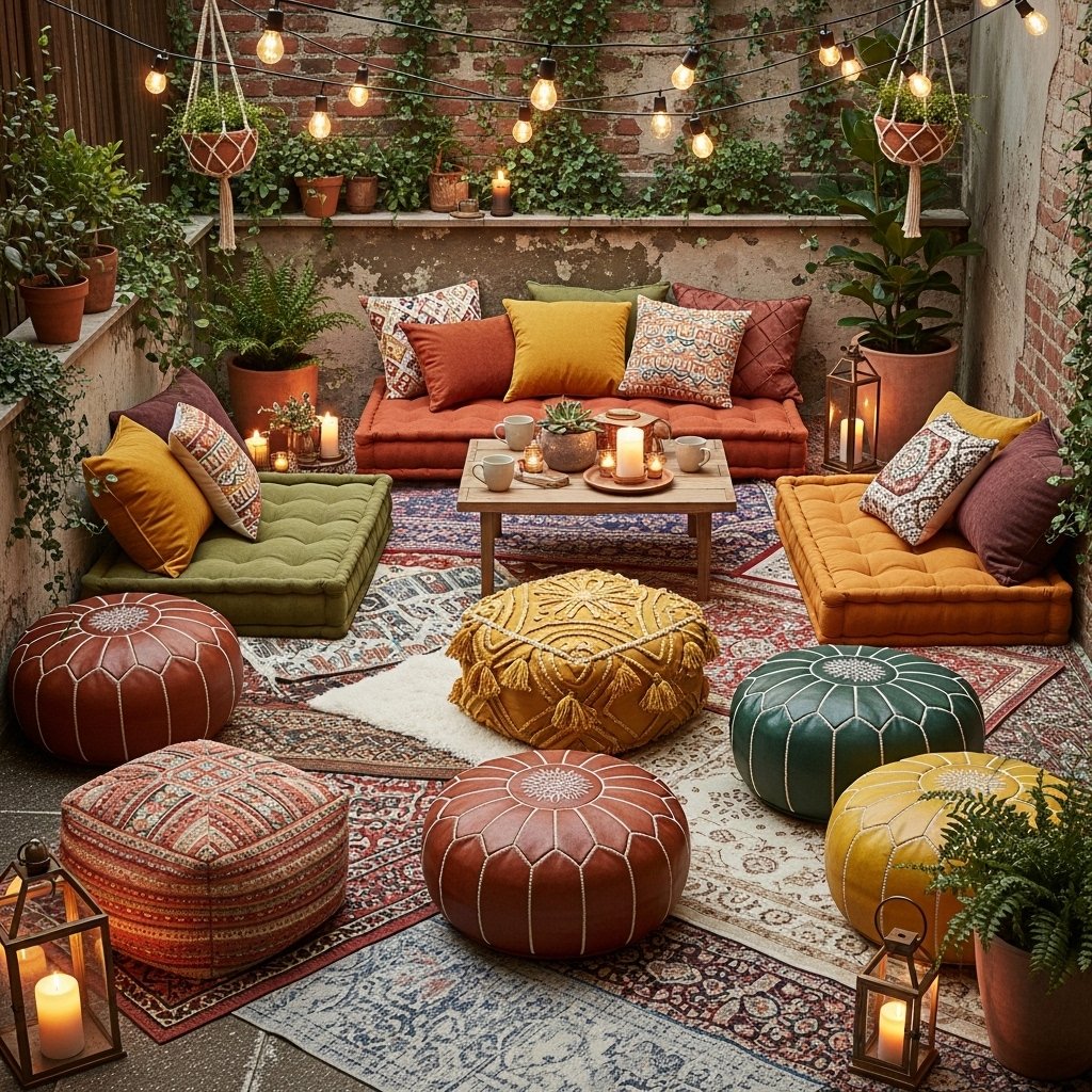 Floor seating is an excellent idea for creating a relaxed small patio interior vibe. Use cushions, poufs, or floor mattresses to create a comfortable lounge-style setup. Choose weather-resistant fabrics to ensure durability in outdoor conditions. This arrangement gives a bohemian and casual feel to the space. It is also flexible, allowing you to rearrange the layout easily when needed.