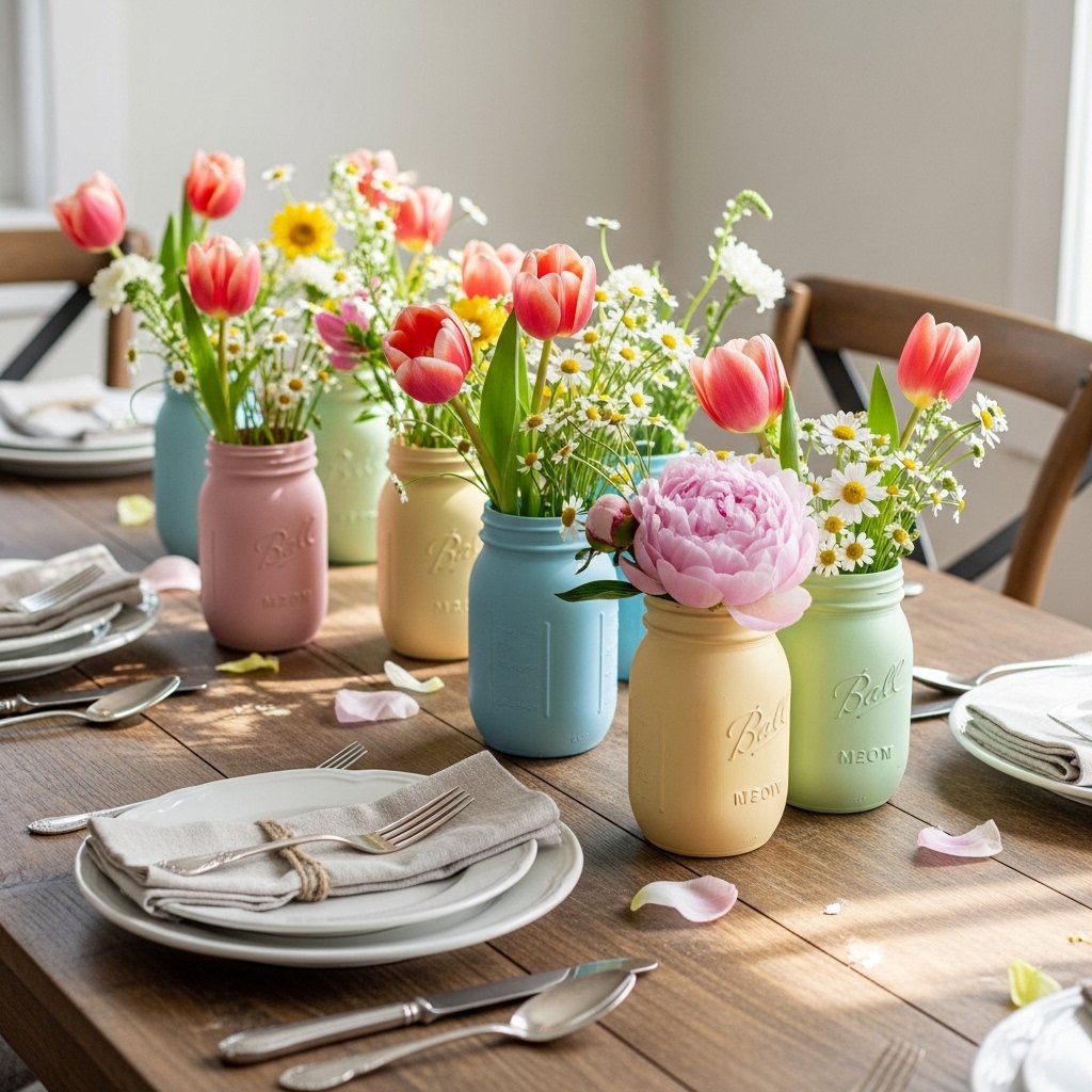 Floral mason jar centerpieces are one of the most popular spring decorating ideas for the home. These charming decorations bring fresh colors and natural beauty to dining tables, coffee tables, and shelves. Simply paint mason jars in pastel shades such as mint green, soft pink, or light yellow to create a spring-inspired look. Add fresh flowers like tulips, daisies, or peonies for a bright and cheerful arrangement. This DIY project is simple, affordable, and perfect for adding a seasonal touch to any room.