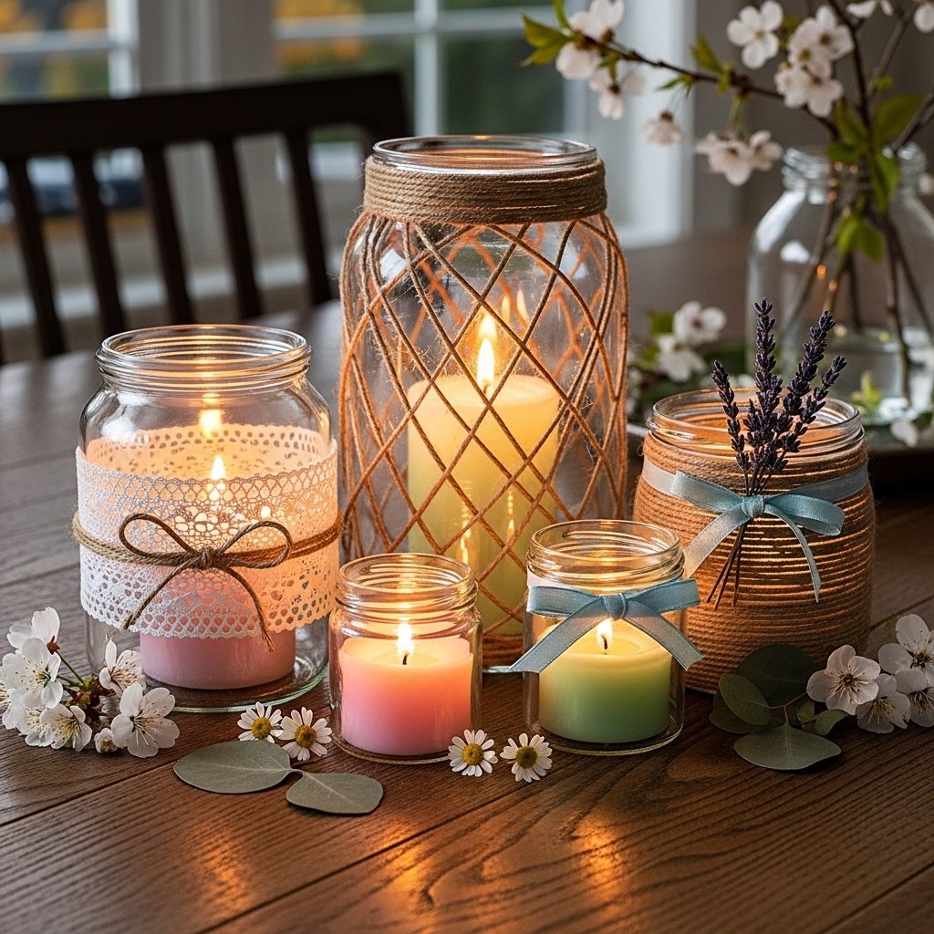Spring candle holders are a cozy and stylish way to decorate your home. You can decorate glass jars or small vases with lace, twine, or dried flowers for a rustic spring look. Soft pastel candles or floral-scented candles enhance the seasonal atmosphere even more. Place them on dining tables, mantels, or bedside tables for a warm decorative glow. This DIY decorating idea combines beauty, fragrance, and relaxing ambiance.