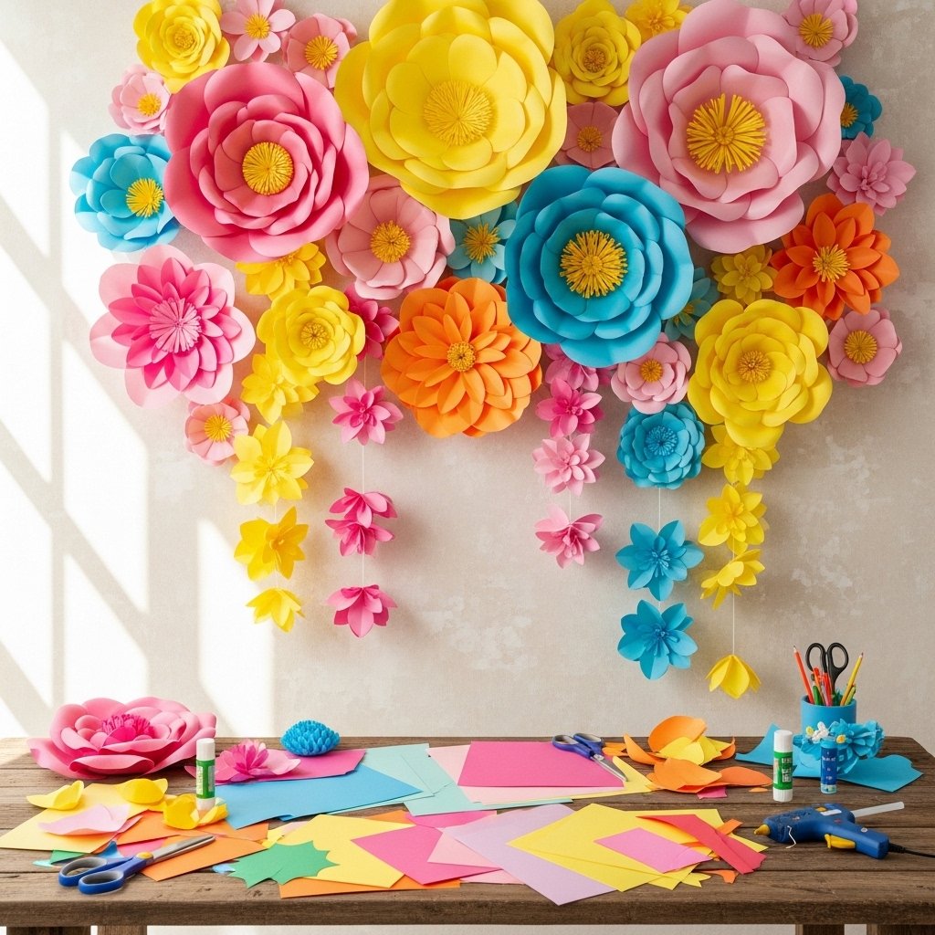 Paper flower decorations are a creative and budget-friendly spring craft. Using colorful craft paper, you can create large decorative flowers that add charm to walls, windows, or party backdrops. These flowers are lightweight and easy to arrange in different patterns. They are especially popular for spring gatherings, birthdays, or seasonal photo backdrops. This DIY project adds a playful and artistic touch to your home décor.