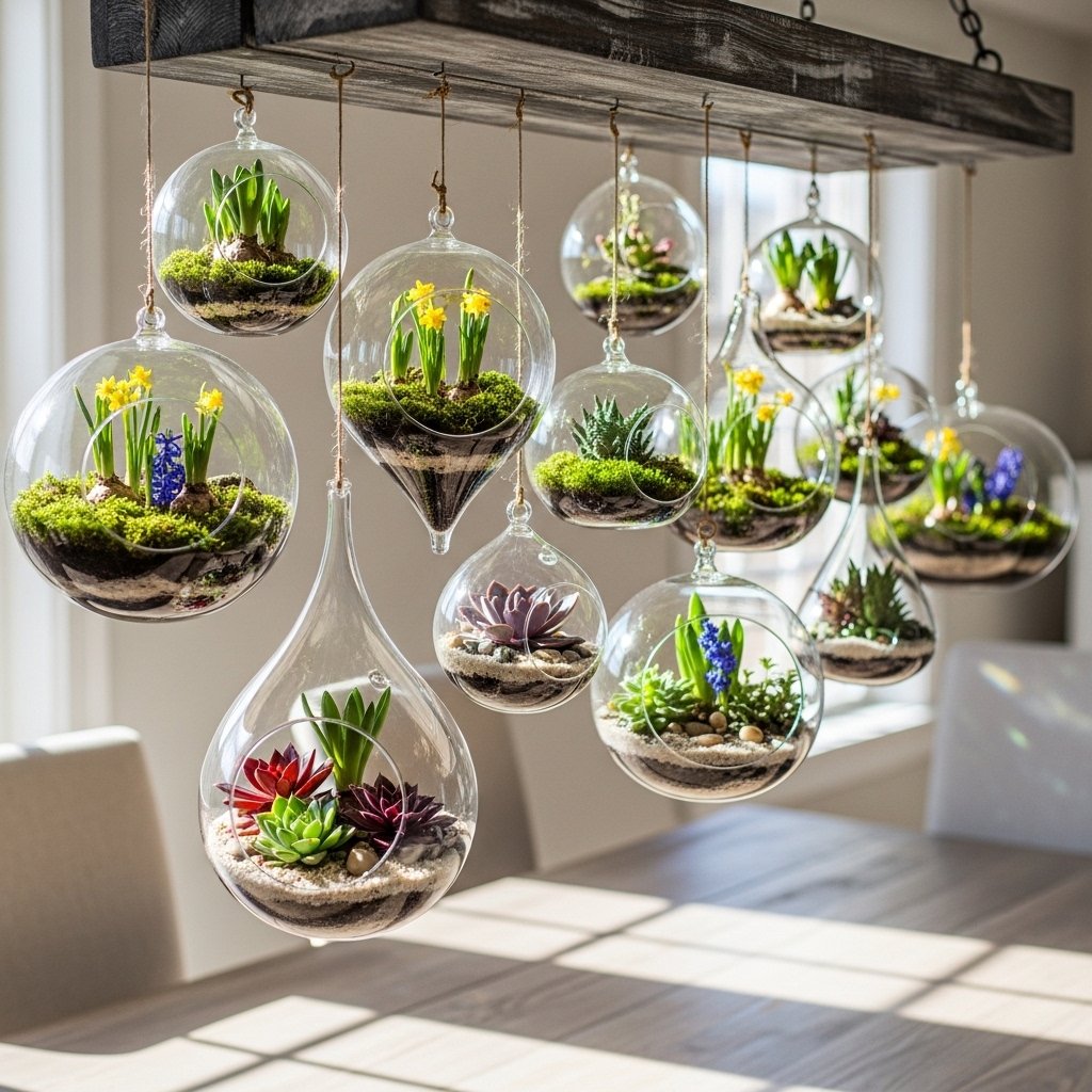 Hanging glass terrariums filled with moss, small plants, or flowers bring a whimsical touch to your walls. Suspend them from the ceiling or brackets to create a floating garden effect. These terrariums are lightweight and visually appealing, perfect for spring décor. They also add a calming, natural element to your space. Ideal for living rooms, dining areas, or even bathrooms, they combine elegance and nature beautifully.