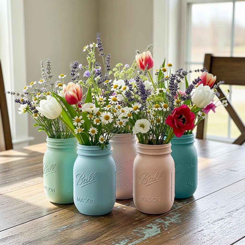 Mason jars are versatile for spring décor and can double as wall-mounted or tabletop art. Painting them in soft spring hues and filling them with fresh flowers adds instant cheer. Hang jars on wooden boards or attach them to walls for a rustic, farmhouse feel. These vases are budget-friendly and allow for endless creativity. They also make a charming centerpiece for your dining or living area.