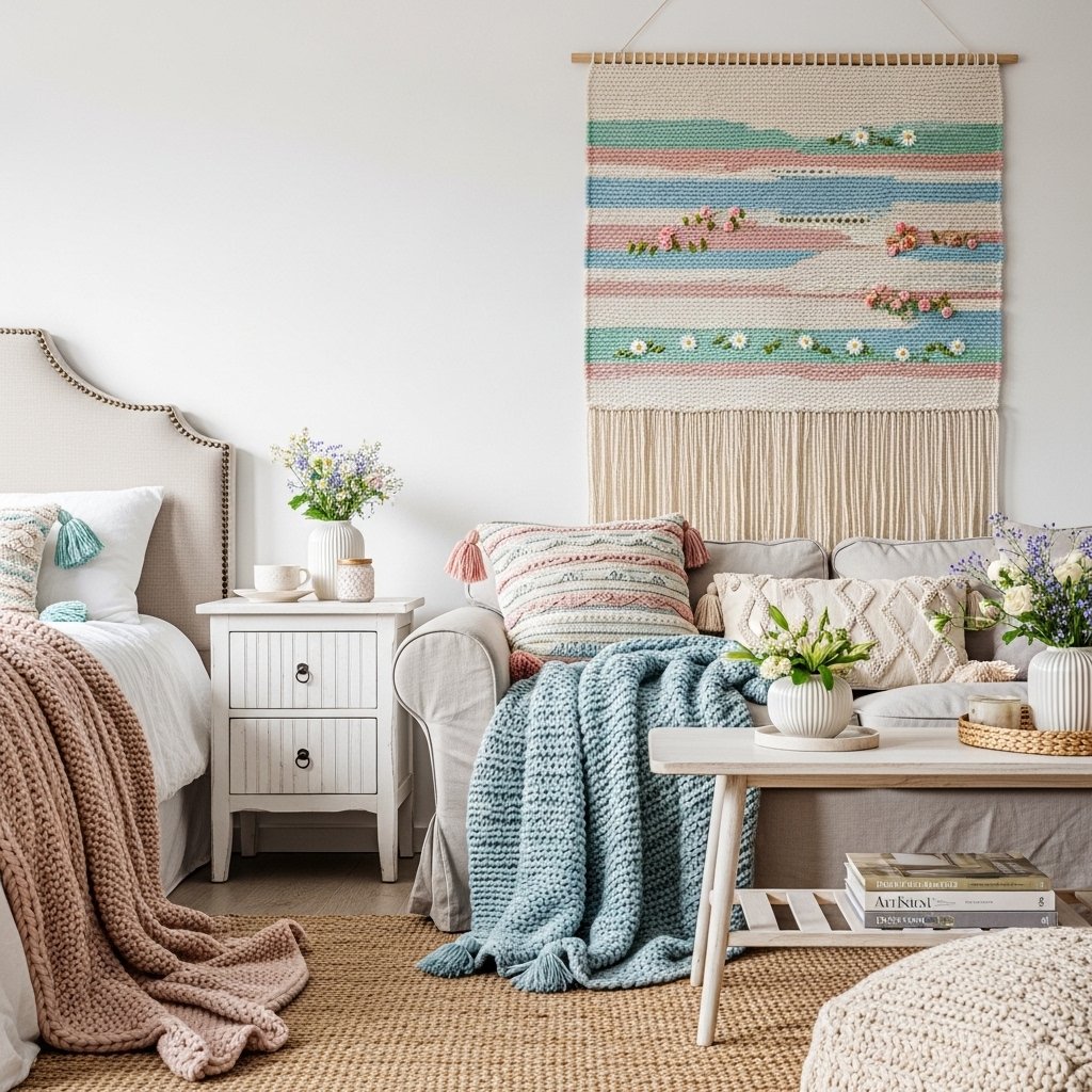 Macramé or woven wall hangings can reflect spring through pastel tones and light textures. These add a boho-chic touch and complement other spring décor elements. Incorporate small flowers or greenery into your weaving for an extra seasonal vibe. Wall hangings are versatile and can easily be swapped with other decorations. They’re perfect for living rooms, bedrooms, and entryways.