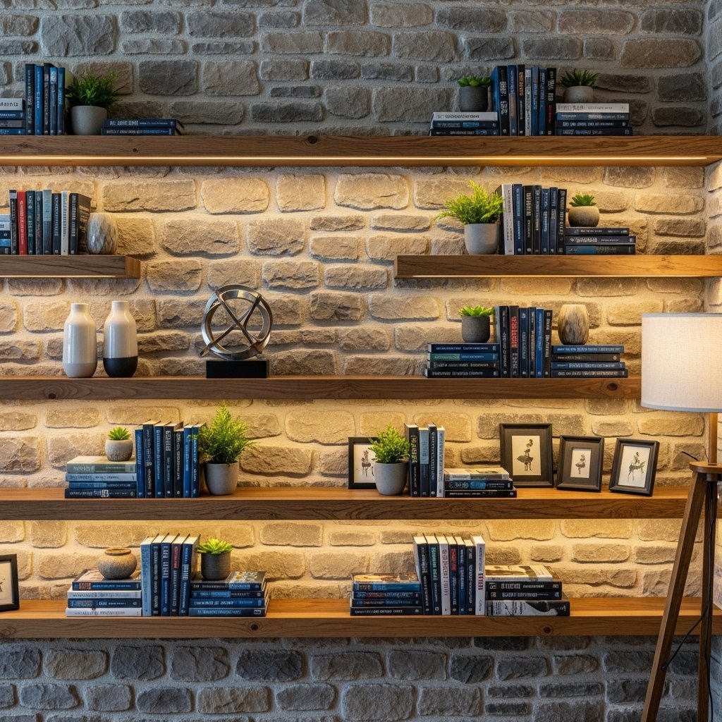Combining a stone wall with built-in shelves adds both style and functionality. The shelves provide space for décor while the stone adds texture. Wooden or metal shelving complements the natural look. This design works well in living rooms, offices, or even bedrooms. It creates a balanced blend of practicality and visual appeal.