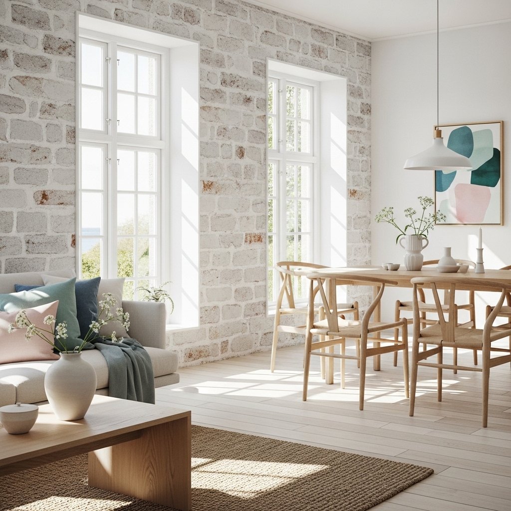 A whitewashed stone wall offers a softer and more modern take on traditional stone design. The light finish brightens the space while maintaining texture. It works especially well in coastal or Scandinavian interiors. Pairing with light-colored furniture enhances the airy feel. This design is perfect for creating a fresh and elegant atmosphere.