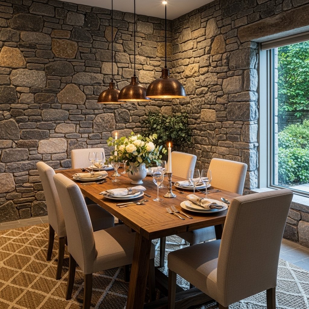 A statement stone wall in the dining area creates a sophisticated and memorable setting. It adds depth and makes the space feel more intimate. Warm lighting enhances the natural tones of the stone. Pairing with a wooden dining table creates a harmonious look. This idea is ideal for hosting and creating a cozy dining experience.