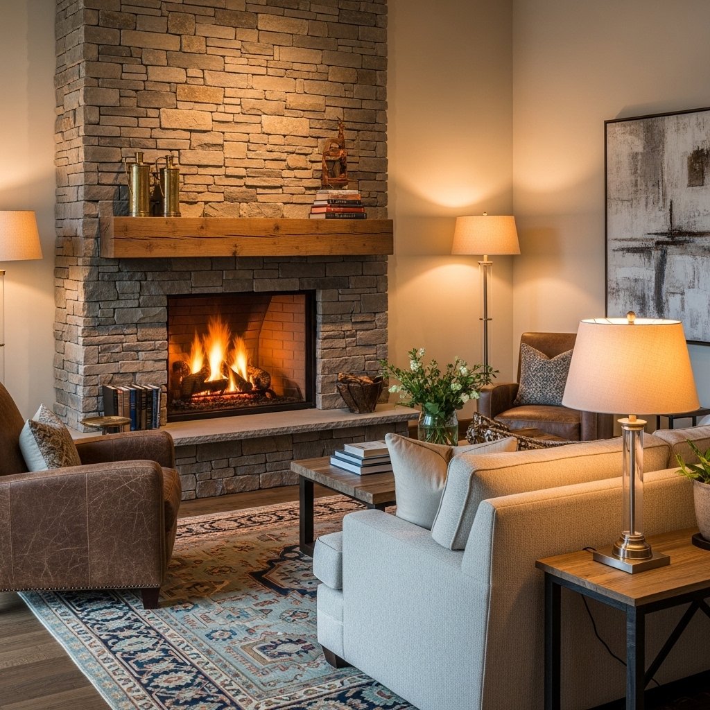 A stone wall around the fireplace instantly becomes the heart of the room. It adds a dramatic and elegant touch while enhancing the warmth of the space. Stacked stone or river rock designs create visual interest and texture. Pairing it with a wooden mantel adds a perfect balance between rustic and refined. This design works well in both traditional and modern homes.