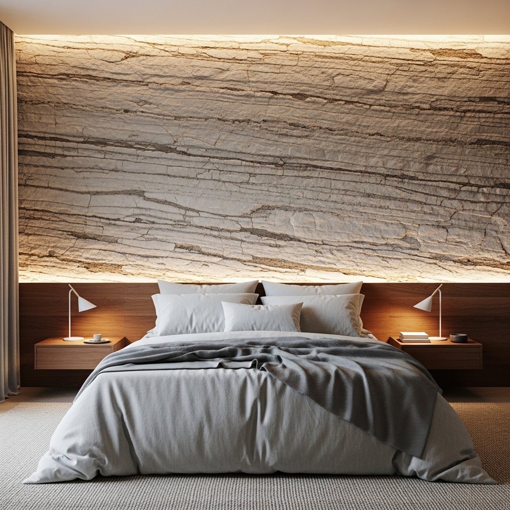 Using a stone wall as a headboard backdrop creates a luxurious and unique bedroom design. Soft lighting enhances the texture while maintaining a relaxing ambiance. Choose lighter stone shades to keep the room from feeling too heavy. Pairing with soft textiles like linen or cotton balances the rough texture of the stone. This idea brings both comfort and sophistication to your bedroom.