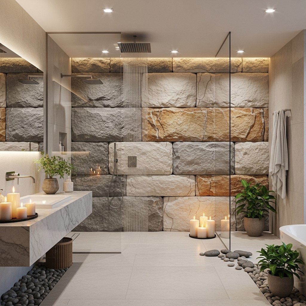 Transform your bathroom into a spa-like retreat with a stone feature wall. Natural stone textures create a calming and luxurious atmosphere. Pair it with glass elements and soft lighting for a serene environment. Water-resistant stone materials ensure durability in humid conditions. This design elevates everyday routines into a relaxing experience.