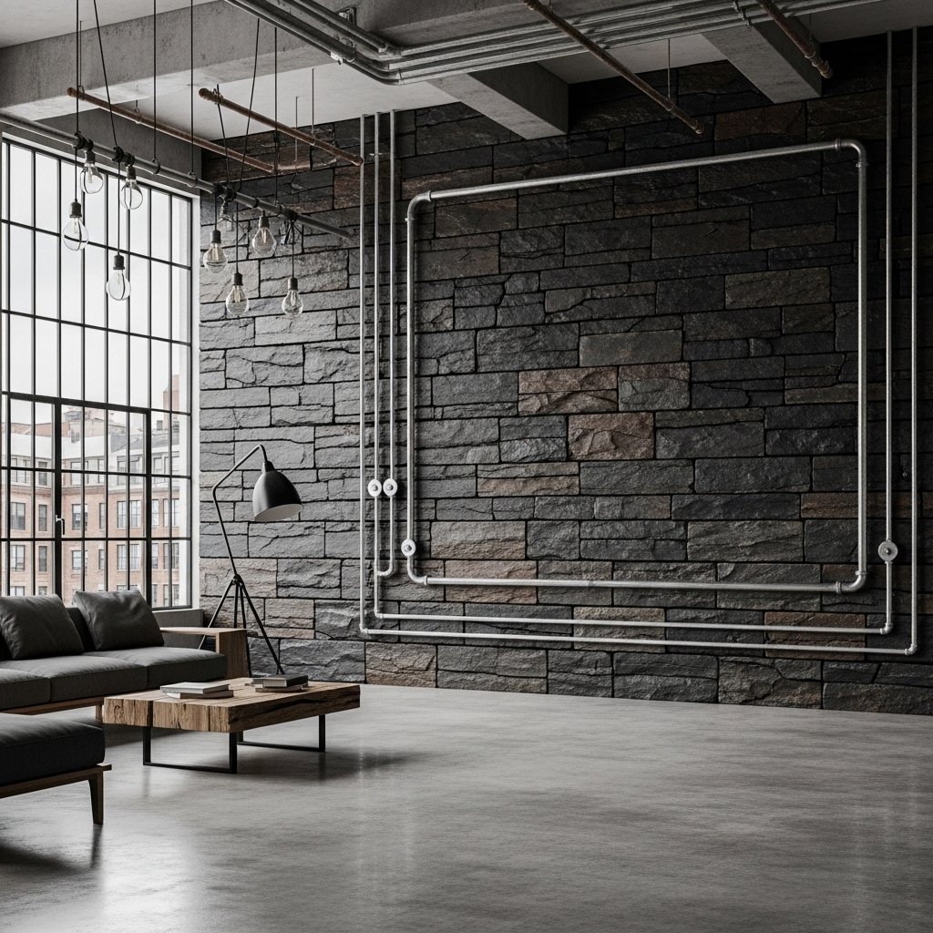 An industrial-style stone wall combines raw textures with modern elements. Pair stone with metal fixtures and exposed pipes for a bold look. Darker stone shades enhance the industrial aesthetic. Minimal décor keeps the focus on the materials and structure. This design is ideal for loft apartments or urban homes.