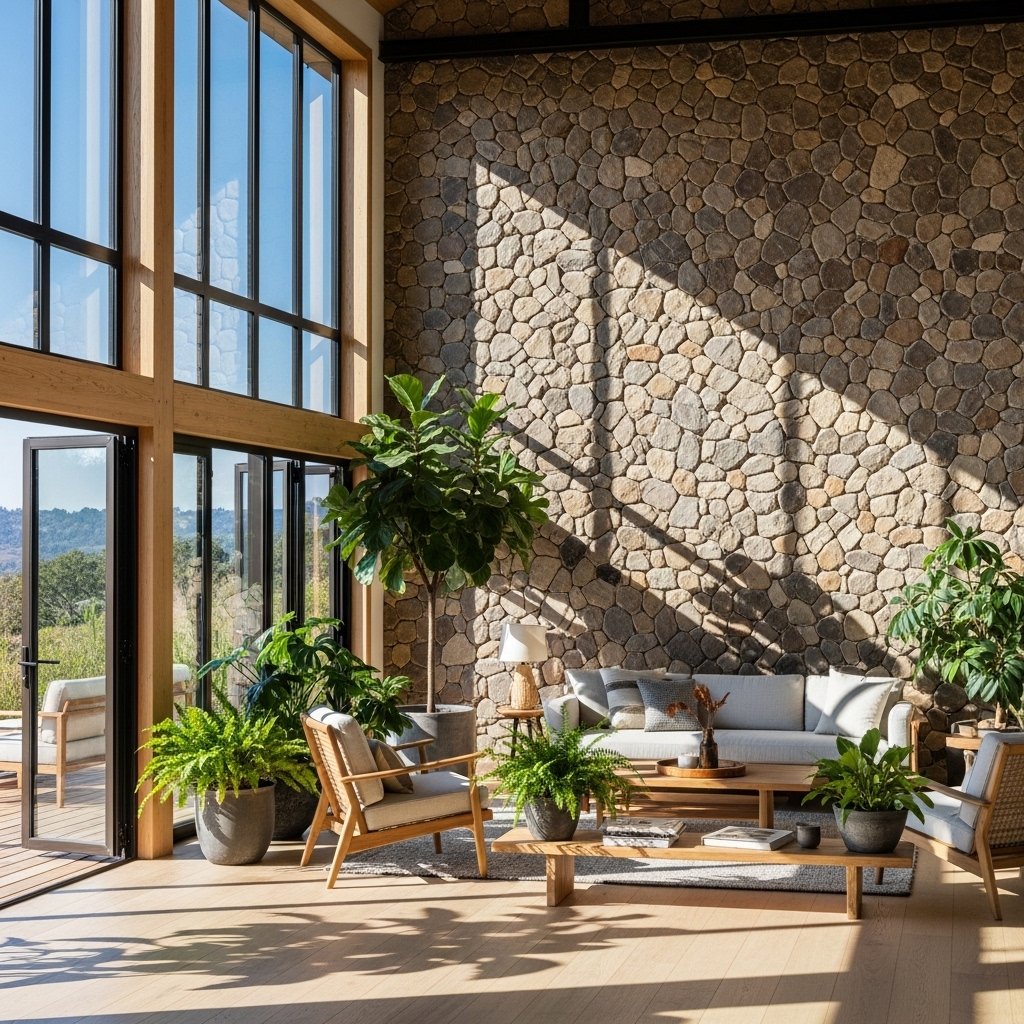 Bring the outdoors inside by incorporating natural stone walls that mimic exterior designs. Use irregular stone patterns to create an organic feel. Large windows and natural light enhance the connection with nature. Pairing with indoor plants completes the look beautifully. This idea creates a refreshing and earthy atmosphere.