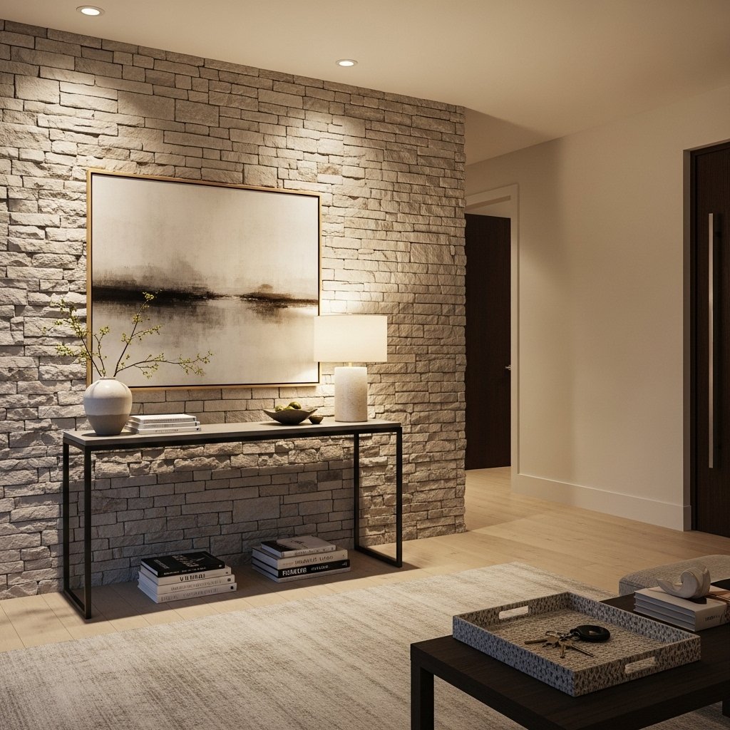 A stone wall in the entryway makes a strong first impression. It adds texture and sets the tone for the rest of the home. Pair it with simple furniture and warm lighting for a welcoming feel. Neutral tones keep the space elegant and not overwhelming. This design instantly elevates your home’s entrance.