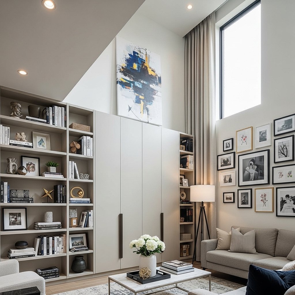 In a townhome, vertical space is just as important as floor space. Utilizing walls for shelving, artwork, and storage helps keep the layout open and uncluttered. Tall bookcases and wall-mounted cabinets draw the eye upward, creating the illusion of higher ceilings. Decorative elements like gallery walls or vertical paneling add visual interest. This approach not only enhances functionality but also elevates the overall design aesthetic.