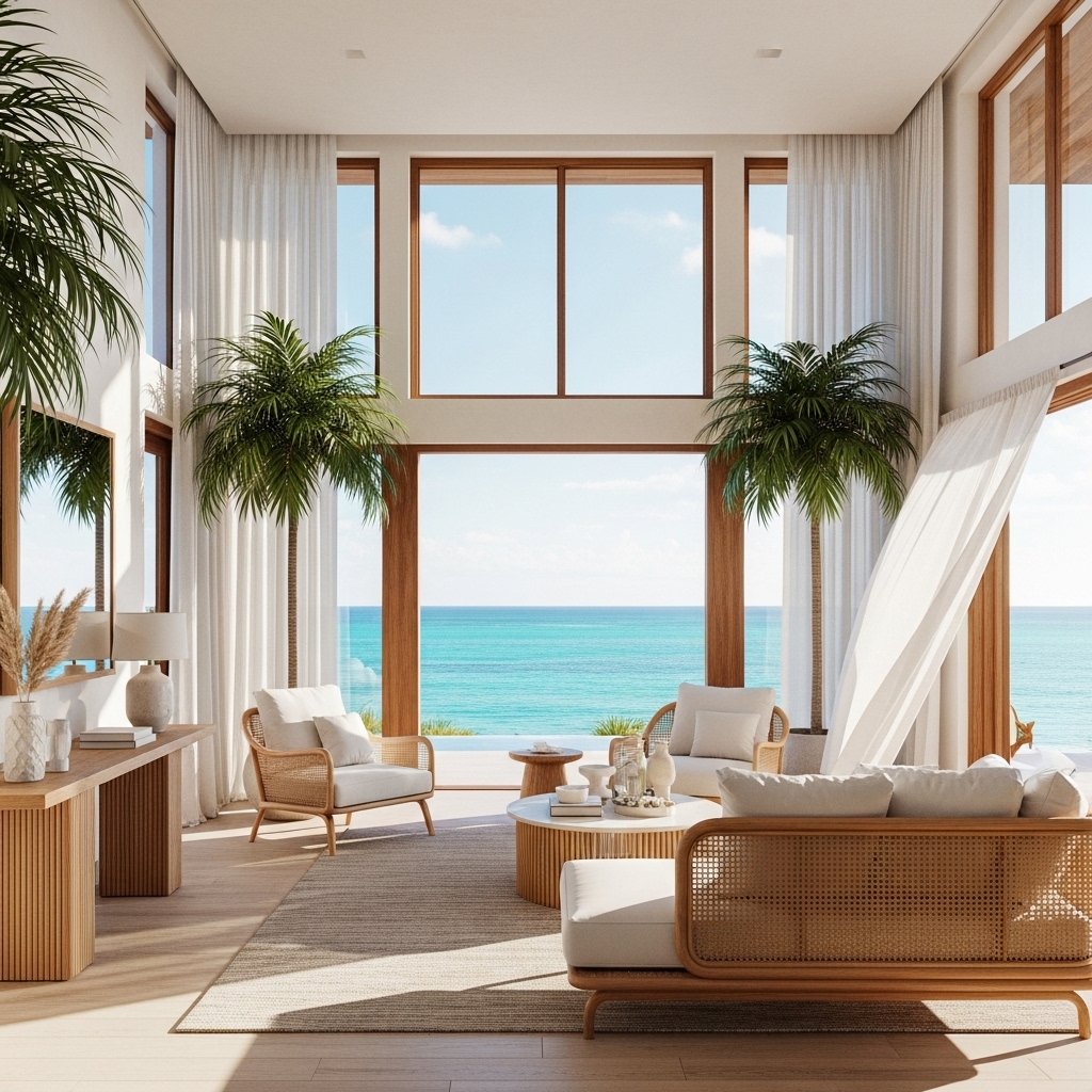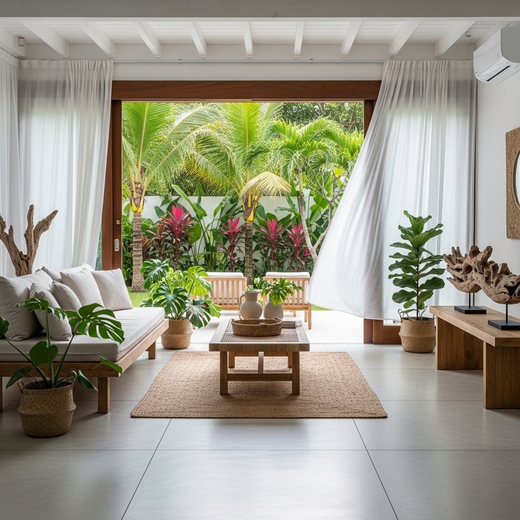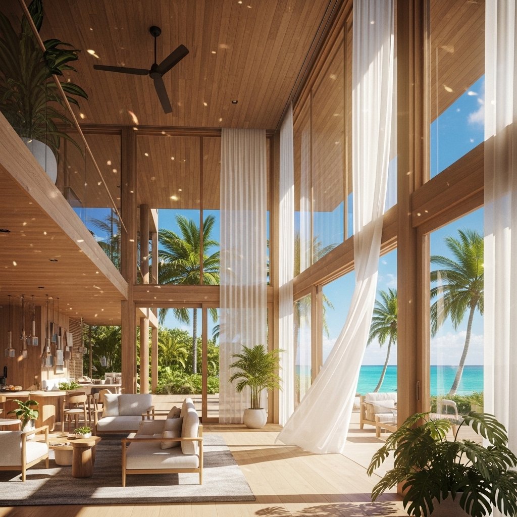 Maximizing natural light is crucial in tropical interior design. Large windows allow sunlight to flood the space, creating a bright and cheerful environment. Sheer curtains or no curtains at all help maintain an open and airy feel. Natural light also highlights textures and colors within the room. This design element enhances both mood and energy efficiency.