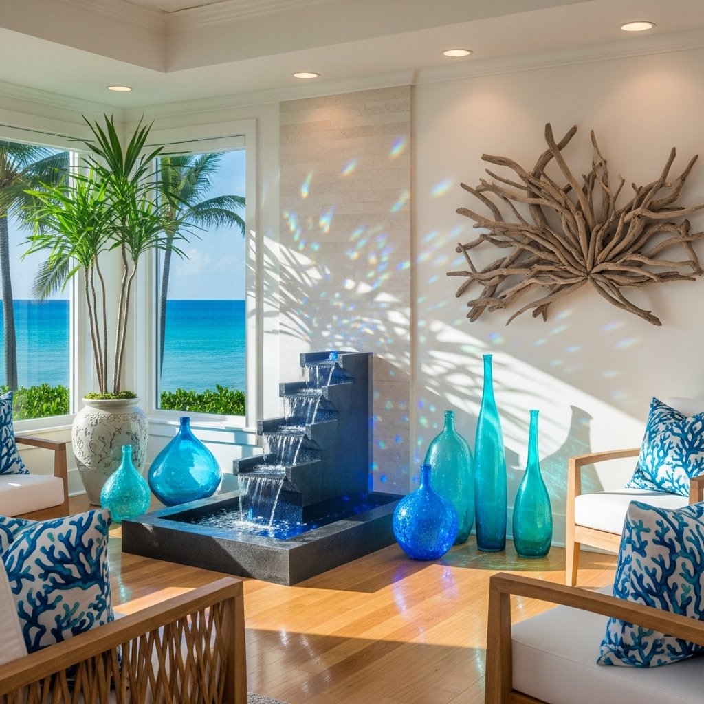 Water features or ocean-inspired decor can enhance the tropical feel of a home. Elements like small fountains, blue accents, or reflective surfaces mimic the calming presence of water. These features add a sense of tranquility and relaxation. Even simple decor like seashells or glass pieces can create a subtle effect. This idea brings a refreshing and soothing touch to the interior.
