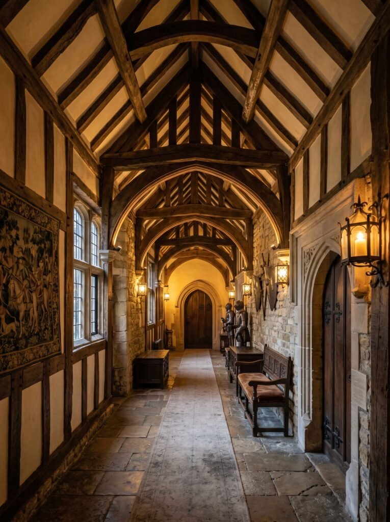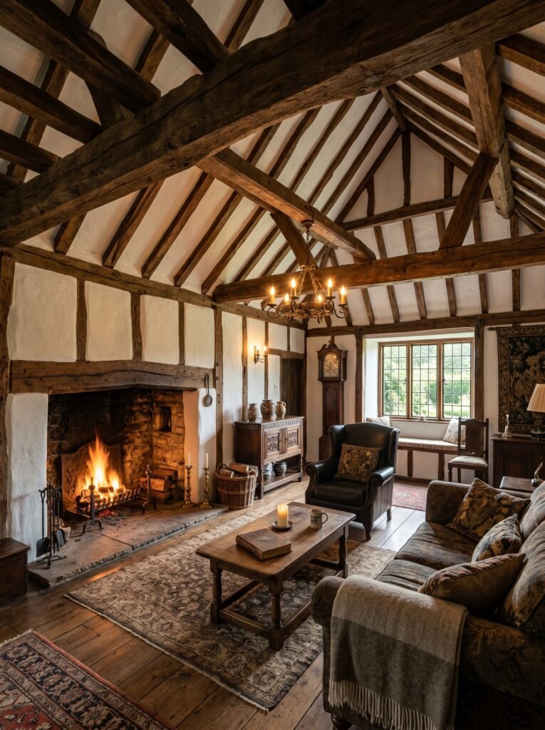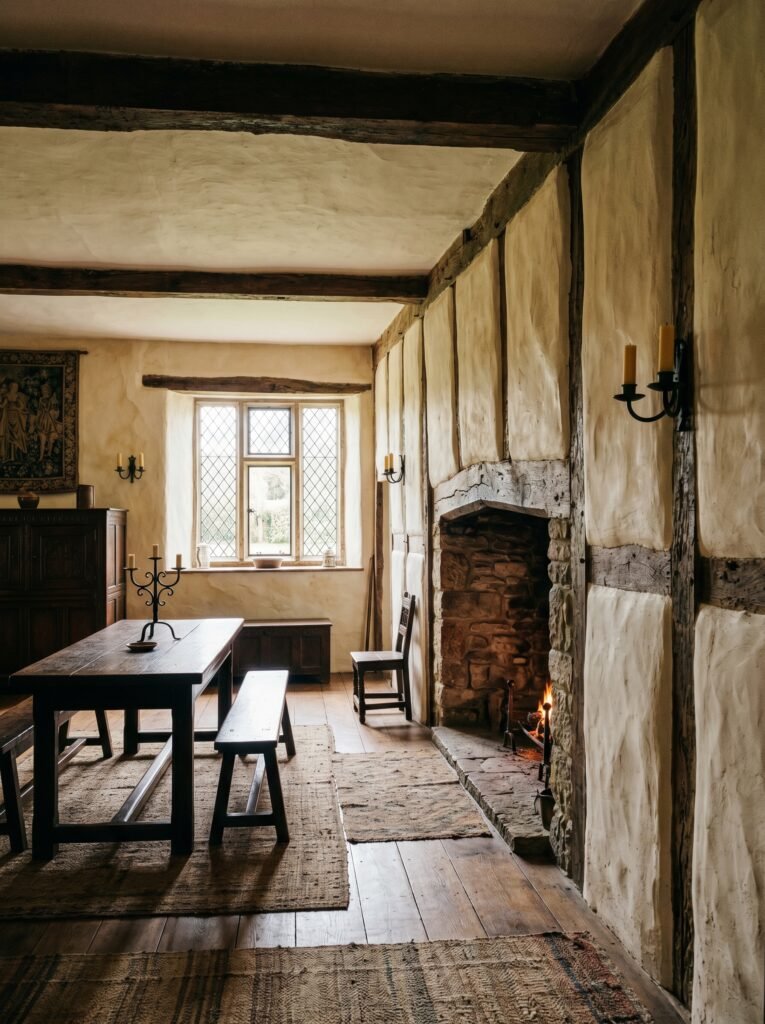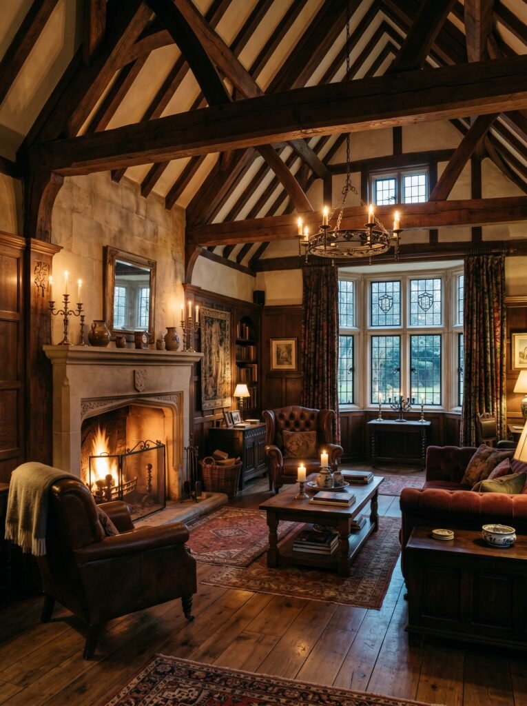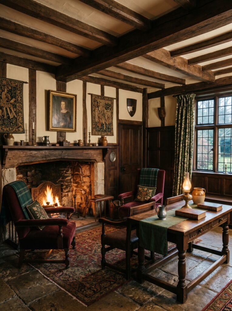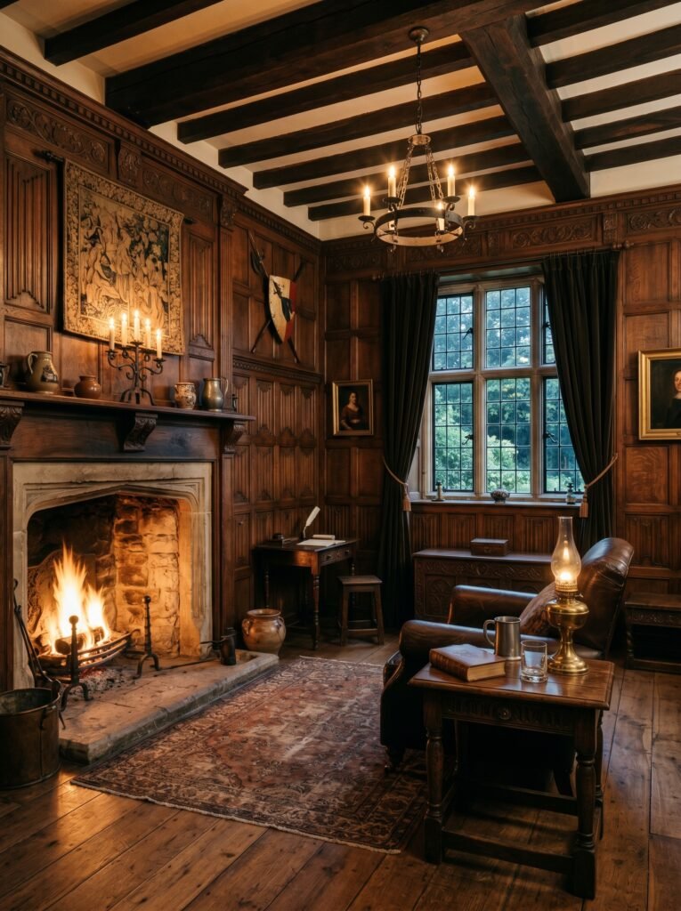 One of the most defining features of a Tudor interior is exposed wooden beams across the ceiling. These beams add depth, structure, and a strong architectural character to any room. Dark-stained oak is commonly used to create a dramatic contrast against lighter walls. This design element instantly gives a historical and authentic medieval feel. Even in modern homes, faux beams can be used to achieve a similar aesthetic without major construction.