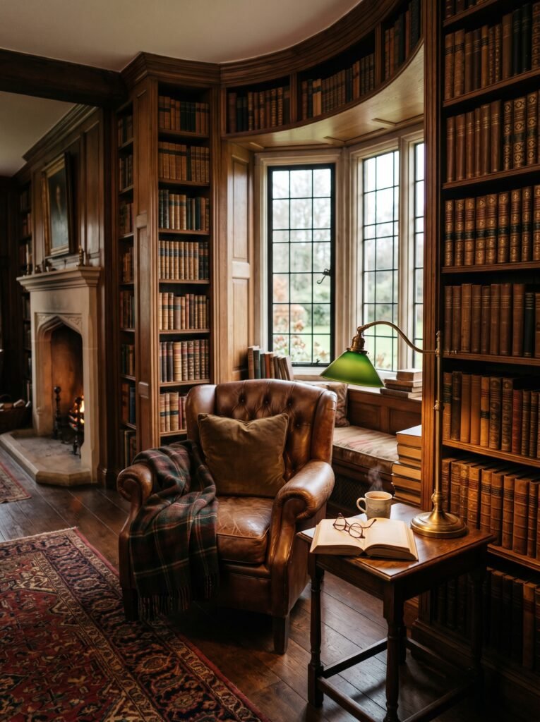 A Tudor interior often includes a cozy library or reading nook filled with wooden shelves and warm lighting. Built-in bookshelves made of dark wood create a scholarly and inviting atmosphere. Comfortable leather chairs or window seats make the space perfect for relaxation. Soft lighting from lamps or wall sconces enhances the cozy feeling. This idea reflects the intellectual and historical charm of Tudor homes.