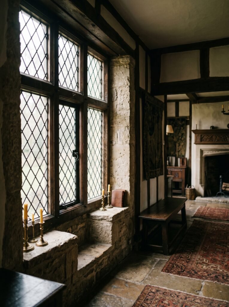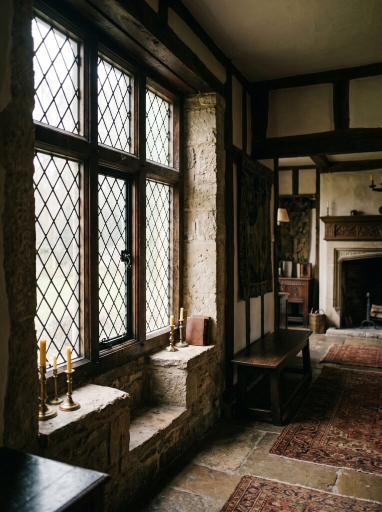 Leaded glass windows are another signature feature of Tudor interiors. These windows often have small, diamond-shaped panes held together by dark metal strips. They allow soft natural light to filter into the room while maintaining privacy. The slightly uneven glass adds to the historical authenticity of the design. This feature works especially well in living rooms, hallways, and staircases.