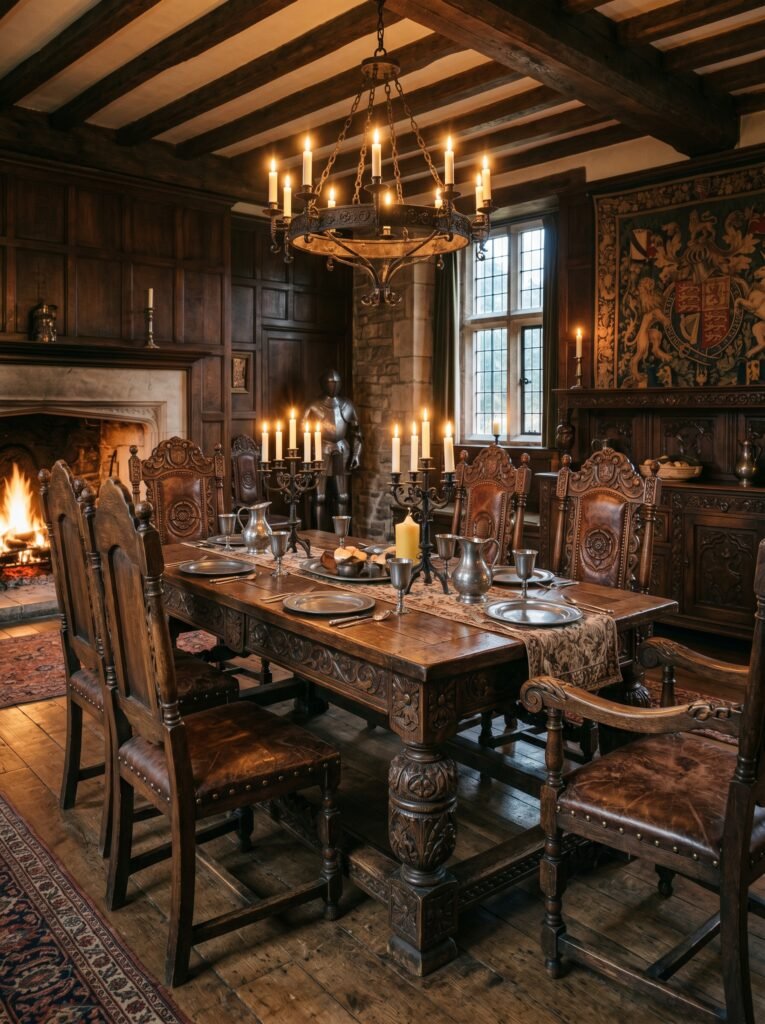 Furniture in Tudor interiors is usually large, sturdy, and made of solid wood. Tables, chairs, and cabinets often feature detailed carvings and traditional craftsmanship. Oak is the most commonly used material due to its durability and rich appearance. Upholstery is often made from leather or thick fabrics for added comfort. This type of furniture enhances the historical and luxurious feel of the space.