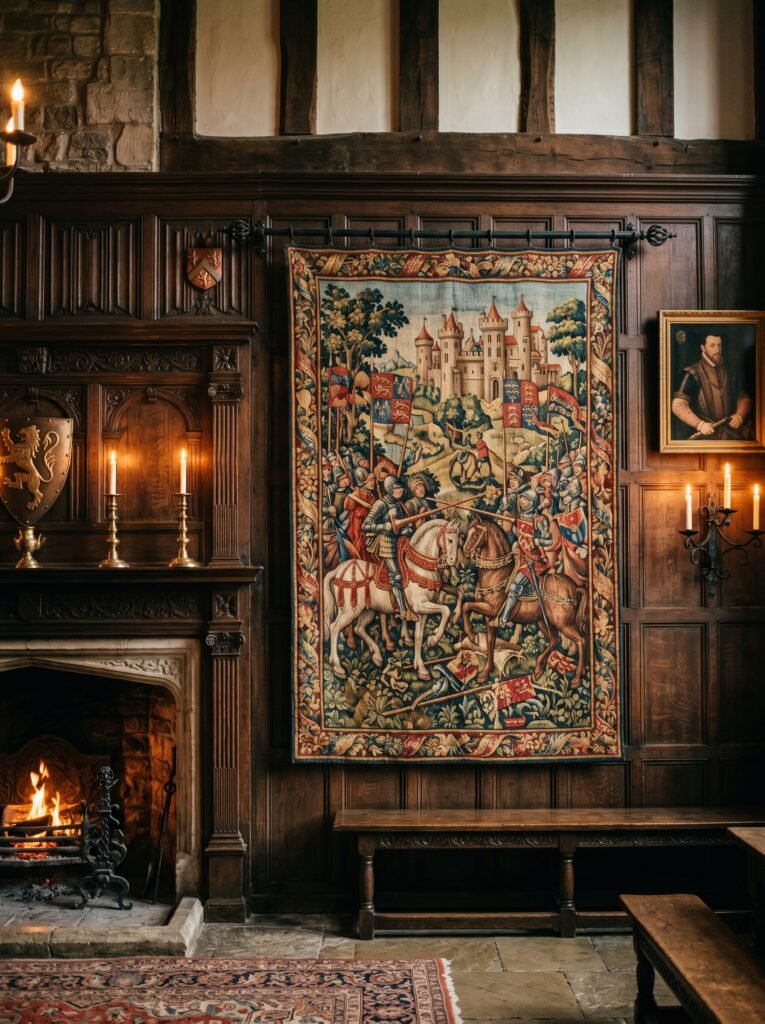 Tapestries are a classic decorative element in Tudor interior design. They were originally used for insulation but now serve as artistic focal points. These wall hangings often depict historical scenes, nature, or royal themes. They add texture, color, and storytelling to plain walls. In modern homes, they can be used to soften heavy wood interiors and add visual interest.
