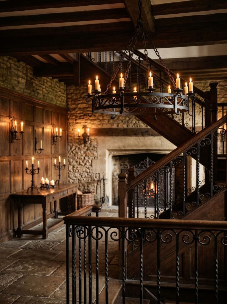 Wrought iron is widely used in Tudor interiors for both functional and decorative purposes. You can find it in light fixtures, stair railings, and fireplace tools. Its dark, handcrafted appearance pairs perfectly with wood and stone materials. Iron chandeliers with candle-style bulbs are especially popular in this design style. These details add a strong medieval and rustic touch to the space.