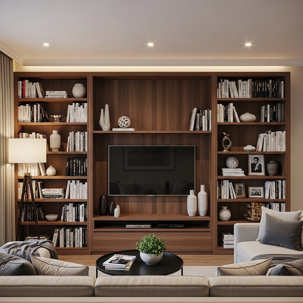 Combining a TV unit with built-in bookshelves creates a functional and visually appealing setup. This design is ideal for book lovers who want to integrate entertainment and reading space. Shelves around the TV create a balanced and symmetrical look. You can also add decorative pieces to enhance the design. It’s a smart way to utilize wall space effectively.