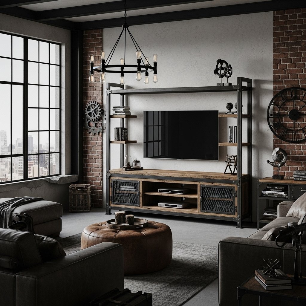 An industrial-style TV unit features raw materials like metal and wood for a bold look. Exposed textures and darker tones create a rugged and modern aesthetic. This design works well in loft-style or contemporary homes. Pair it with minimal décor to maintain its unique character. It’s a great choice for those who prefer edgy and unconventional designs.