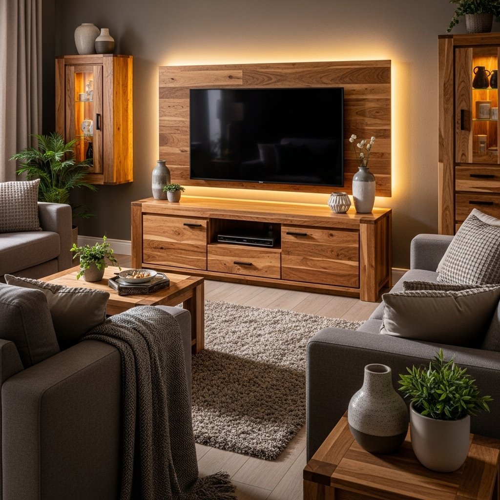 A wooden TV unit interior brings warmth and natural beauty into your living room. Rich wood textures create a cozy and inviting atmosphere that feels timeless. You can choose from light oak finishes to darker walnut tones depending on your décor theme. Adding subtle lighting enhances the grain and texture of the wood. This style works well in both traditional and contemporary homes.