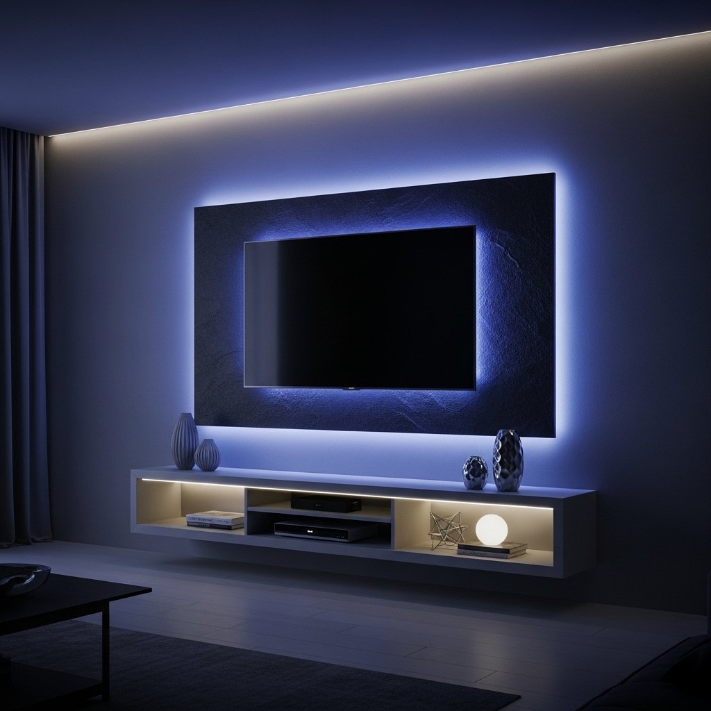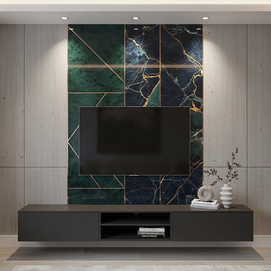 Adding decorative panels behind your TV can instantly elevate the design. Materials like textured laminates, marble, or 3D panels create a striking visual impact. These panels act as a backdrop that draws attention to the TV area. You can experiment with patterns and colors to match your interior theme. This idea works well as a focal point in the living room.