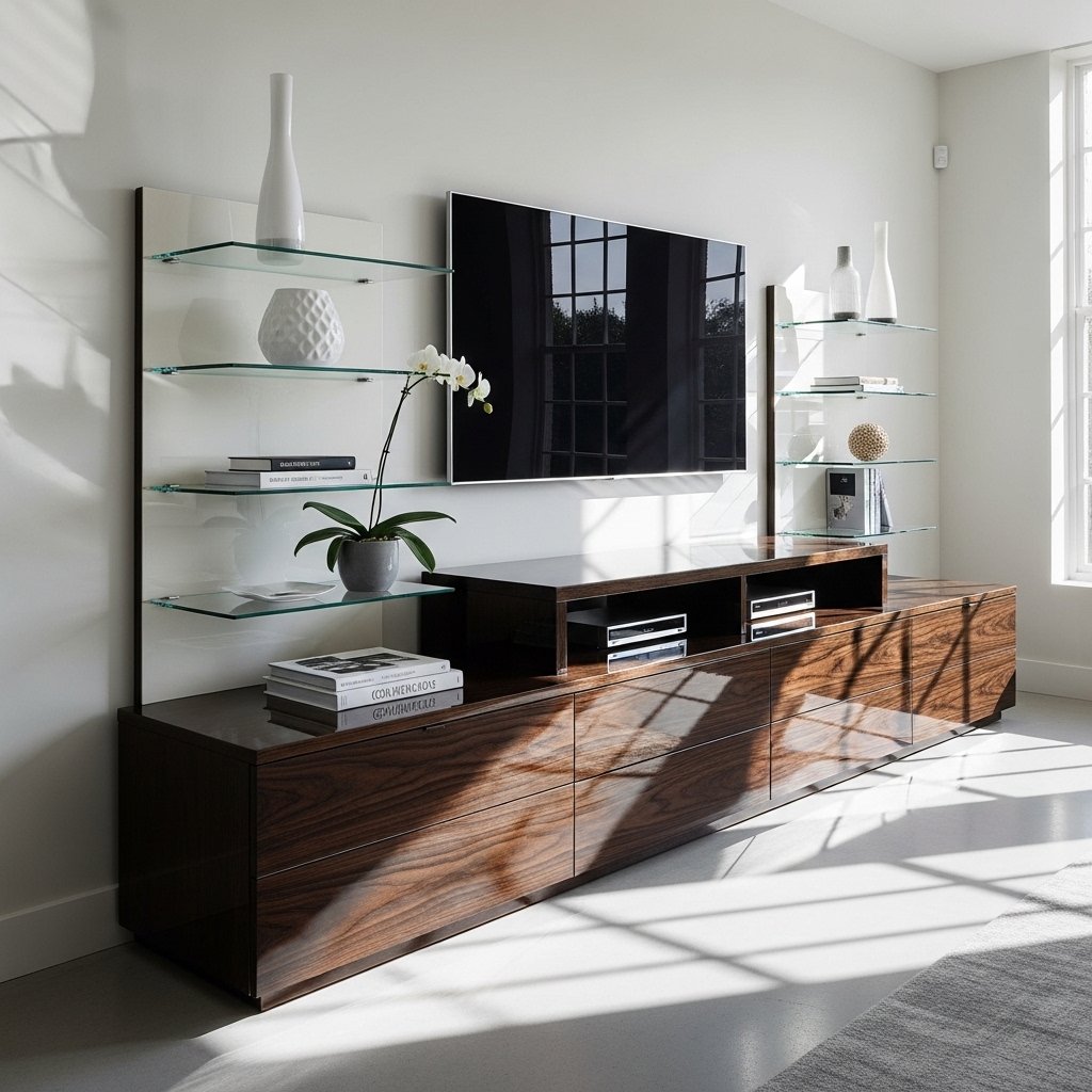 A glass and glossy finish TV unit adds elegance and sophistication to your space. Reflective surfaces create a sense of openness and make the room appear larger. This style works especially well in modern and high-end interiors. Pair it with neutral colors and minimal décor for the best effect. It’s a great choice for those who love a sleek and polished look.