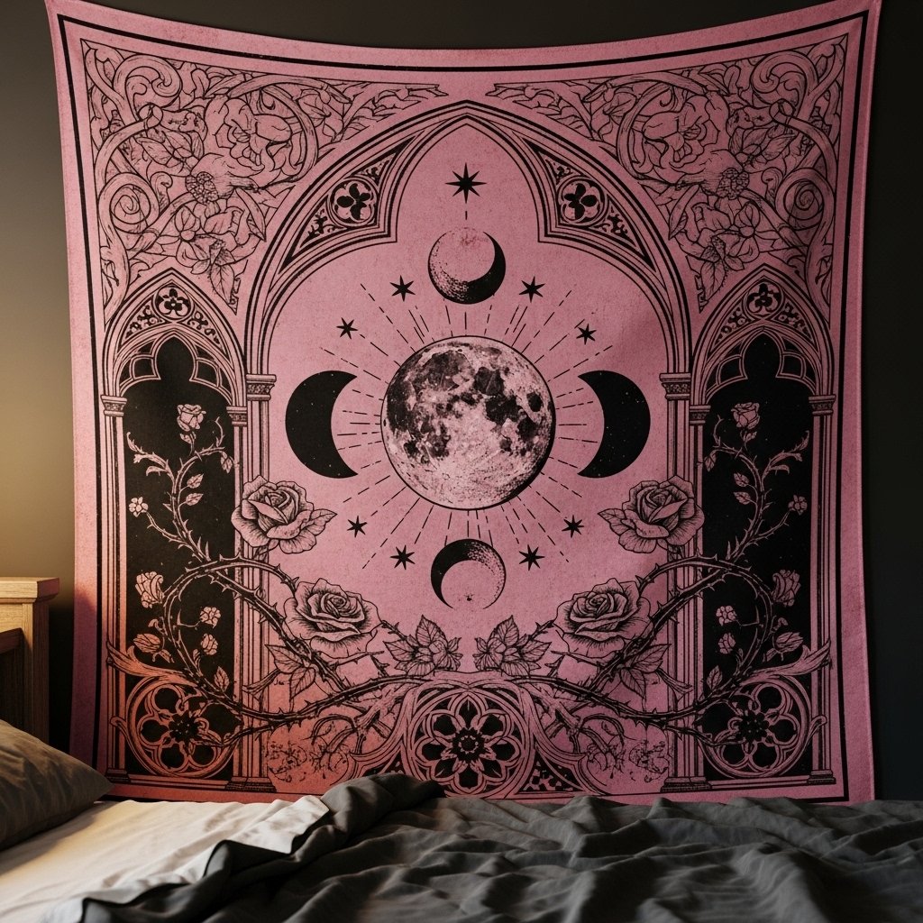 Wall tapestries instantly fill empty spaces while strengthening the grunge theme. Choose faded pink fabrics featuring celestial, floral, or gothic patterns. Combining pink with black artwork creates contrast without overpowering the softness. Hang tapestries slightly loose rather than stretched tight for a relaxed look. This adds texture and visual warmth to blank walls.