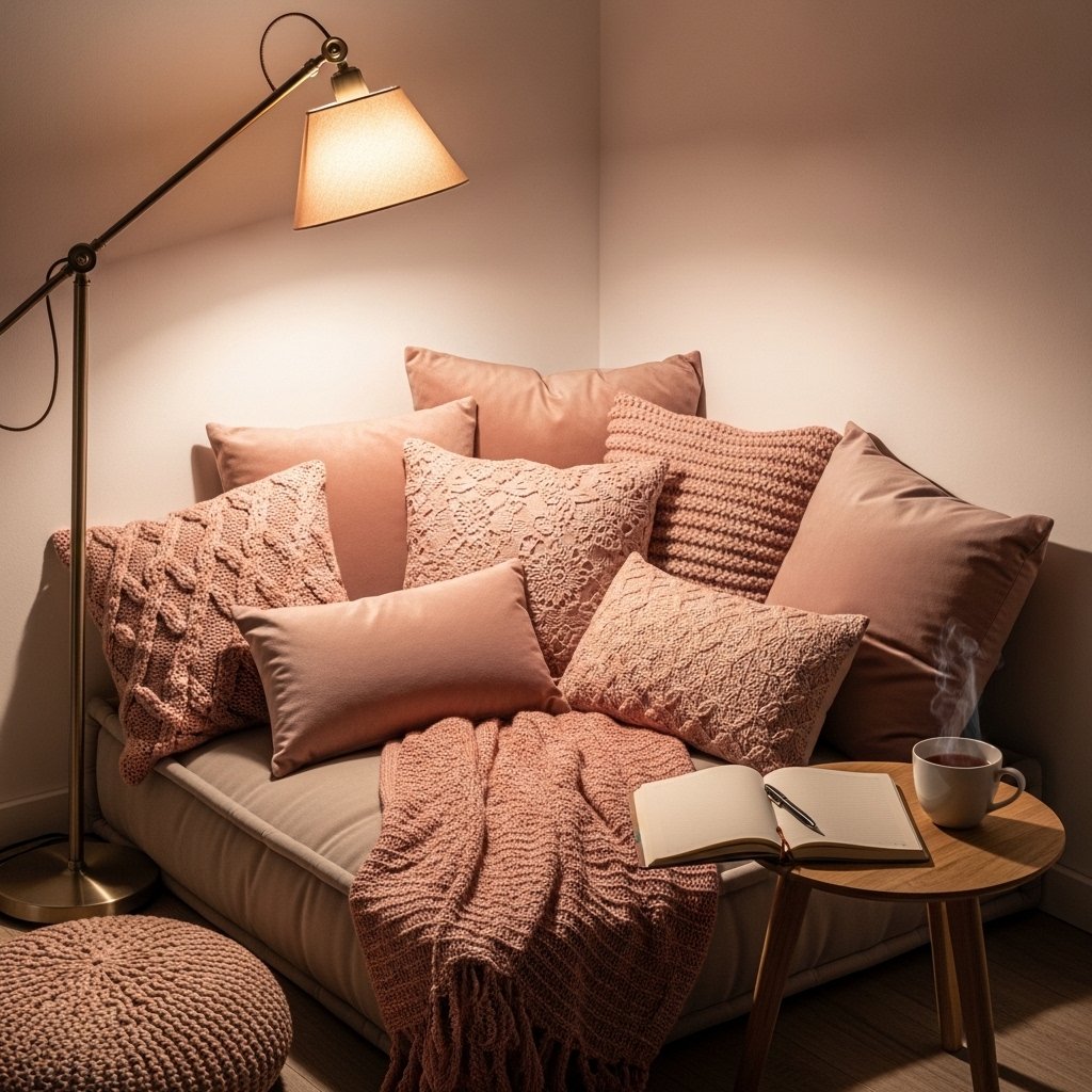 Create a cozy relaxation corner using a small chair, bean bag, or floor cushions. Add multiple throw pillows in velvet, lace, and knitted fabrics for comfort and style. Mix dusty pink shades with cream and dark accents for balance. This corner becomes perfect for reading, journaling, or listening to music. Comfortable spaces complete the inviting vintage grunge atmosphere.