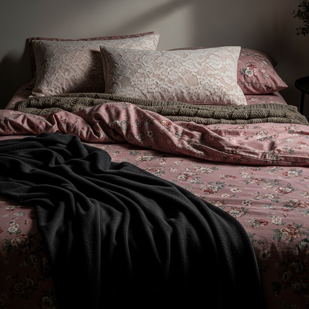 Vintage floral bedding in faded pink tones instantly softens the grunge style while keeping it nostalgic. Pair delicate flower patterns with black or charcoal blankets to create contrast and depth. Layering textures like lace sheets and knitted throws makes the bed visually interesting and comfortable. This mix prevents the room from feeling overly sweet or overly dark. The balance of softness and moodiness defines the grunge pink aesthetic perfectly.
