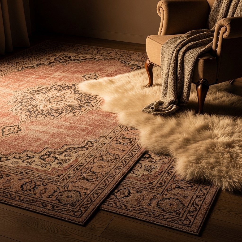 Layered rugs help create a cozy and lived-in vintage appearance. Combine a Persian-style rug with a neutral or faux fur rug for depth and comfort. Soft pink tones mixed with worn patterns enhance the grunge personality. The layered flooring prevents the space from feeling empty or minimal. It also makes the room warmer and more inviting.