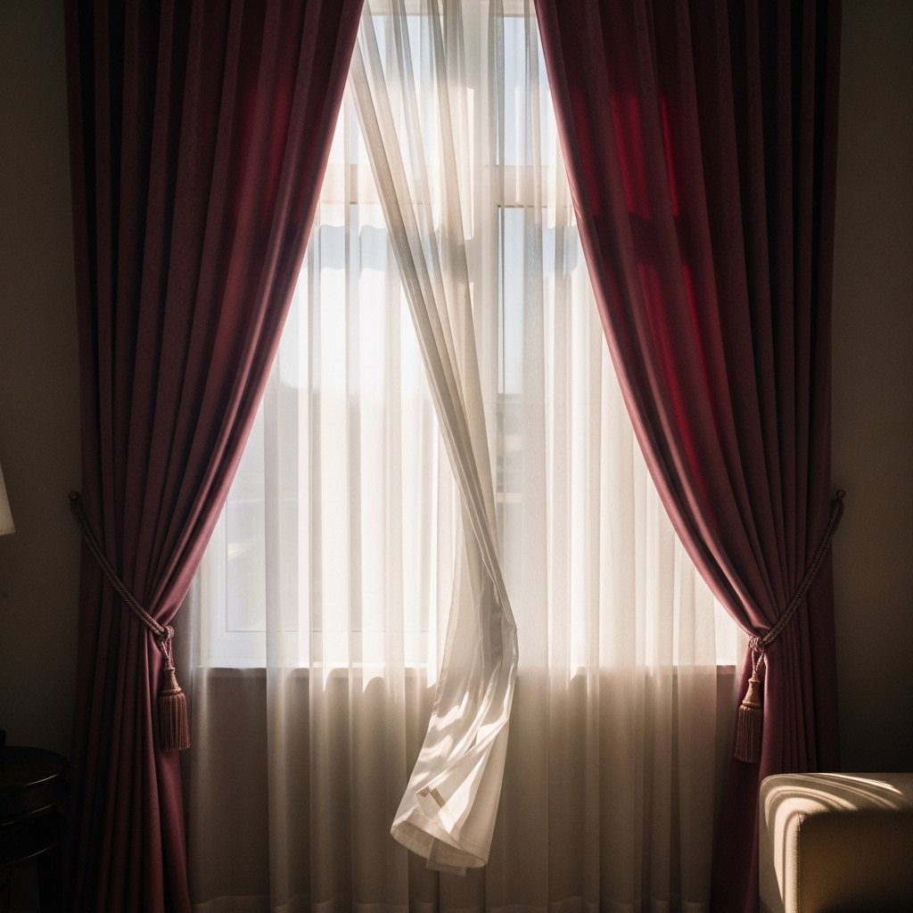 Window styling is important for balancing light and mood in the room. Combine sheer white curtains with heavier pink or burgundy drapes for layered depth. Daylight passes softly through the sheer fabric creating a romantic atmosphere. At night, darker curtains add a moody grunge touch. This layered look also improves privacy while enhancing aesthetics.