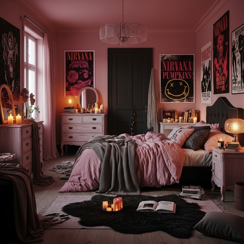 Start your grunge pink room by choosing dusty pink or faded rose walls to set the mood instantly. Instead of smooth perfect paint, slightly textured or matte finishes enhance the vintage atmosphere beautifully. Decorate the walls with band posters, retro art prints, and film photography for authentic grunge character. Crooked placement and layered frames add to the effortless imperfect aesthetic. This combination creates a cozy yet rebellious backdrop for the entire room.